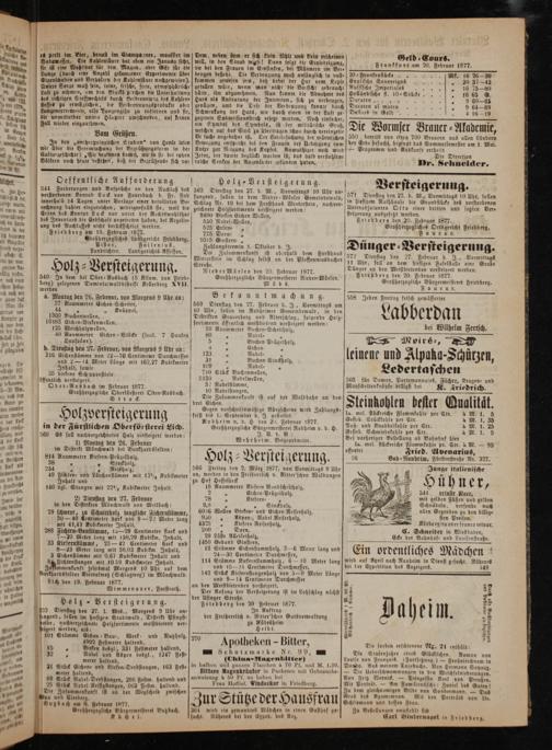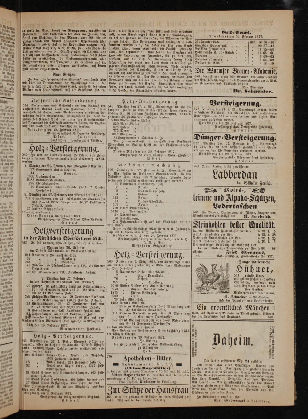 a 1. 50 114 Stämme Kiefernstammholz, 6— 10 Meter lang] wird auf April nach Nauheim in Dlenst gesucht. Näheres —— 3 e e 3 und 1024 Centimeter Burchmesser, bei der Expeditton des Anzeigers. 149 — Durkhardsfelder Vieinalweg(Schlagweg) im Mönchwald. 142 b e e cee Meter Länge 1 Lich den 19. Februar 1877. an den Meistbietenden versteigert. 5 28 12 2 Wimmenauer, Forstrath. Der Anfang der Versteigerung ist im Lohschlag nächst 8 8— 1. Halbe 0 der Usinger Straße. 8 5* S2 „e ö Holz- Versteigerung. Friedberg den 20 Februar 1877.* 70 352 Dienstag den 27. I. Mts., Morgens 9 Uhr an⸗ a In Auftrag 22 U E 8 8 — sengend, sollen im hlesigen Stabiwald, Distritt Pfingsi⸗ der Freiherrlich v. Ritter schin Gutsverwaltung 35 1* 82 4 beide, nachverzeschnete Holzsortimente meistbletend ver— zu Rüdesheim 5 82 4 11 seigert werden, als: f Heldt. 88 72 1 101 Stämme(ichen Bau-, Werk: und Nuß holz, 270 5 8 8 852 r 200 Feümeter haltend, Apotheken- Bitter, ene 1 g 85 1 38 5 N 11 W W 81 Schutzmarke Nr. 9 95 Die Stufenfahre elnes Glücklichen. Roman von 711— 1 5 zaltead pe g.,(Chuina-Magenbitter) Louise von Francois. Woensehung)— Frobnleichnam in 1 ö 3 in halben und ganzen Flaschen à 70 Pf. und M. 1.20.] Dondo. Aus meinem Tagebuche. Von Hermann Sovaurx— g g— ö 2¹ 9 8 und Birken ⸗Derbstangen, 163 Sesi⸗ Bittere Magenkräuter in Packeten mit Gebrauchs-]— Die Ueberschwemmungen in den Selgfelntzberadgds. eee 1 4 4 anweisung à 50 Pf. zu haben bei Von Fritz Wernick.— Prinzessin Karl von Preußen. ö 2 1 2 58 Bad e Fase N Frau MHoflief. Windecker in Friedberg. Mit Porträt.— Am Familientische: Zuviel des. 100 4 4 ö 8 a 4. 50 3— Zu dem gleichnamigen Bilde von Sondermann.— Das 1 Ae ist an der Wegscheld zwischen f ur Stu e der Hausfrau Grab des Agamemnon. Mit den Porträts von Pe 1. Purbach an G Feber 177. a Sanna dad besten Neun. 1 2 11 Großherzogliche Bürgermeisterel Buß bach. 364 wird ein gewandte Madchen in einen Gasthof ge— Zu Bestellungen empfiehlt sich 4 Ku ch e l. sucht. Näheres bei der Exped. des Anz. Carl Bindernagel in Irtedderg.