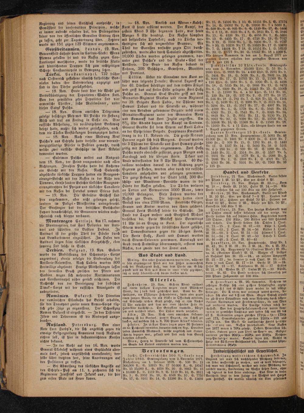 — 18. Nov Nach einer Meldung Reuf Pascha's aus Schipka hatte derselbe neue vierund⸗ vierzigpfündige Mörser in Position gemacht, durch welche zwei russische Geschütze im Fort Nikolai demontirt wurden.