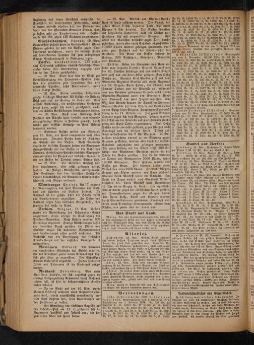 Serbien. Belgrad, 19. Nov. Gestern wurde die Mobilisirung des Schumadja⸗ Corps angeordnet; ebenso erfolgte die Einberufung der Artillerie-Reservisten. Nach Cubria wurden 800 Freiwillige abgesandt. Heutige Mittheilungen lassen den formellen Bruch zwischen der Pforte und Serbien wegen sich mehrender Recriminationen aus Constantinopel näher gerückt erscheinen. Die Nachricht von der Vereinigung des serbischen Timok⸗ Corps mit der russischen Avantgarde ist unbegründet.