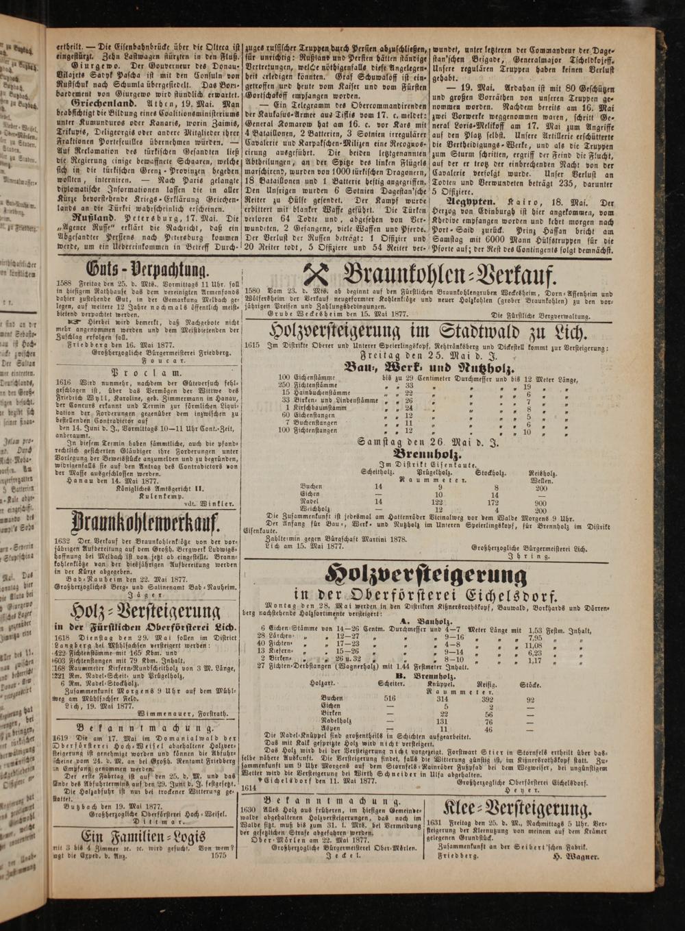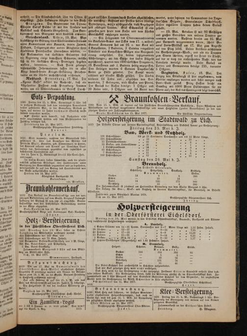 in der Fürstlichen Oberförsterei Lich. 1618 Dienstag den 29. Mai sollen im District Langberg bei Mühlsachsen versteigert werden: 422 Fichtenstämme mit 165 Kbm. und (603 Fichtenstangen mit 79 stbm. Inhalt, 168 Raummeter Kirfern⸗Rundscheitholz von 3 M. Länge, 221 Rm. Nadel⸗Scheit- und Prügelholz,