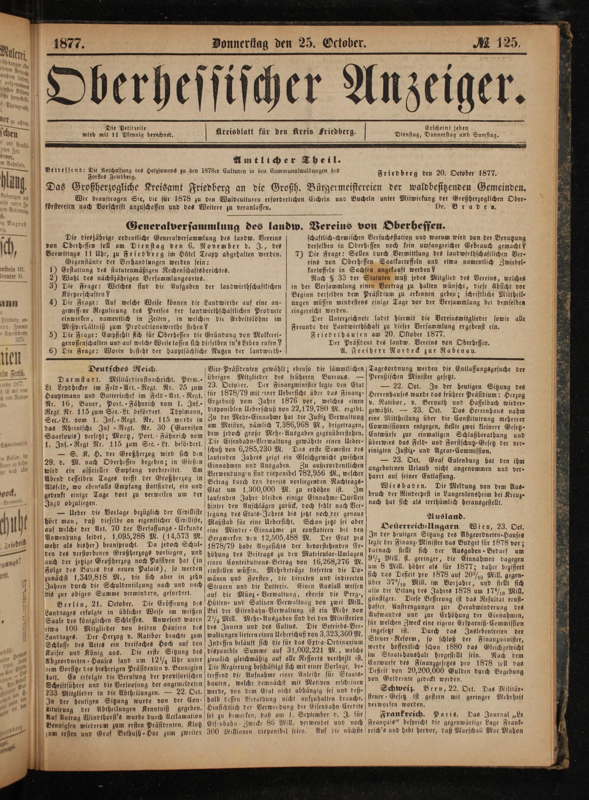 Der Unterzeichnete ladet hiermit die Vereinsmitglieder sowie alle Freunde der Landwirthschaft zu dieser Versammlung ergebenst ein. Friedelhausen am 20. Oktober 1877. Der Präfident des landw. Vereins von Oberhessen. A. Freiherr Nordeck zur Rabenau.