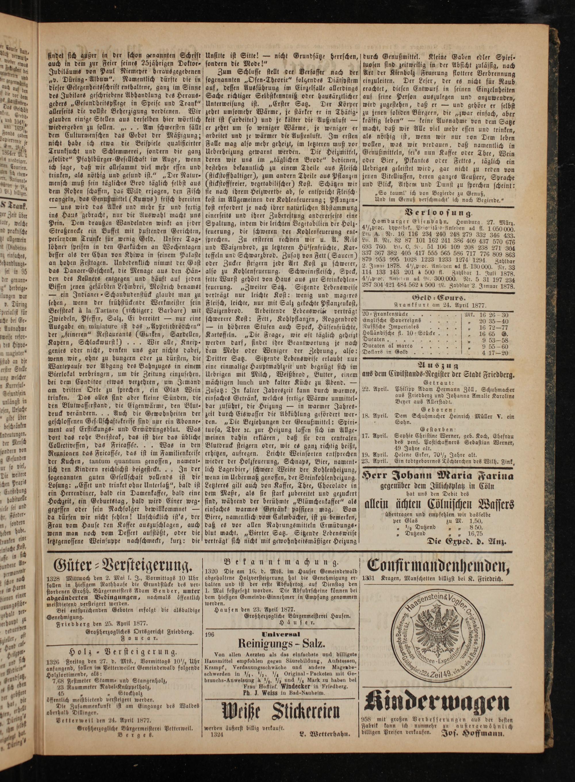 20 ⸗Frankenstücte.[et. 16 26 30 Englische Sovereigns 0„ 20 35-40 Russische Imperiale„ 16 72—77 Holländische fl. 10⸗ Stücke„ 16 65 G. Ducaten.„„ 9 53—58 Ducaten al marco 2 9 5560 Dollars in Gold ö 4 17—20 Auszug aus dem Civilstands⸗Register der Stadt Friedberg. Getraut: 22. April. Philipp Adam Hermann Zöll, Schuhmacher aus Friedberg und Johanna Amalie Karoline Beyer aus Allerstadt. Geboren: 18. April. Dem Schuhmacher Heinrich Müller V. ein . Sohn. Gestorben: 17. April. Sophie Christine Werner, geb. Koch, Ehefrau des pens. Postschaffners Sebastian Werner, 49 Jahre alt. 19. April. Helene Erker, 70½ Jahre alt. 23. April. Ein todtgeborenes Töchterchen des Wilh. Fink, 2 2— 2 Herr Johann Maria Farina