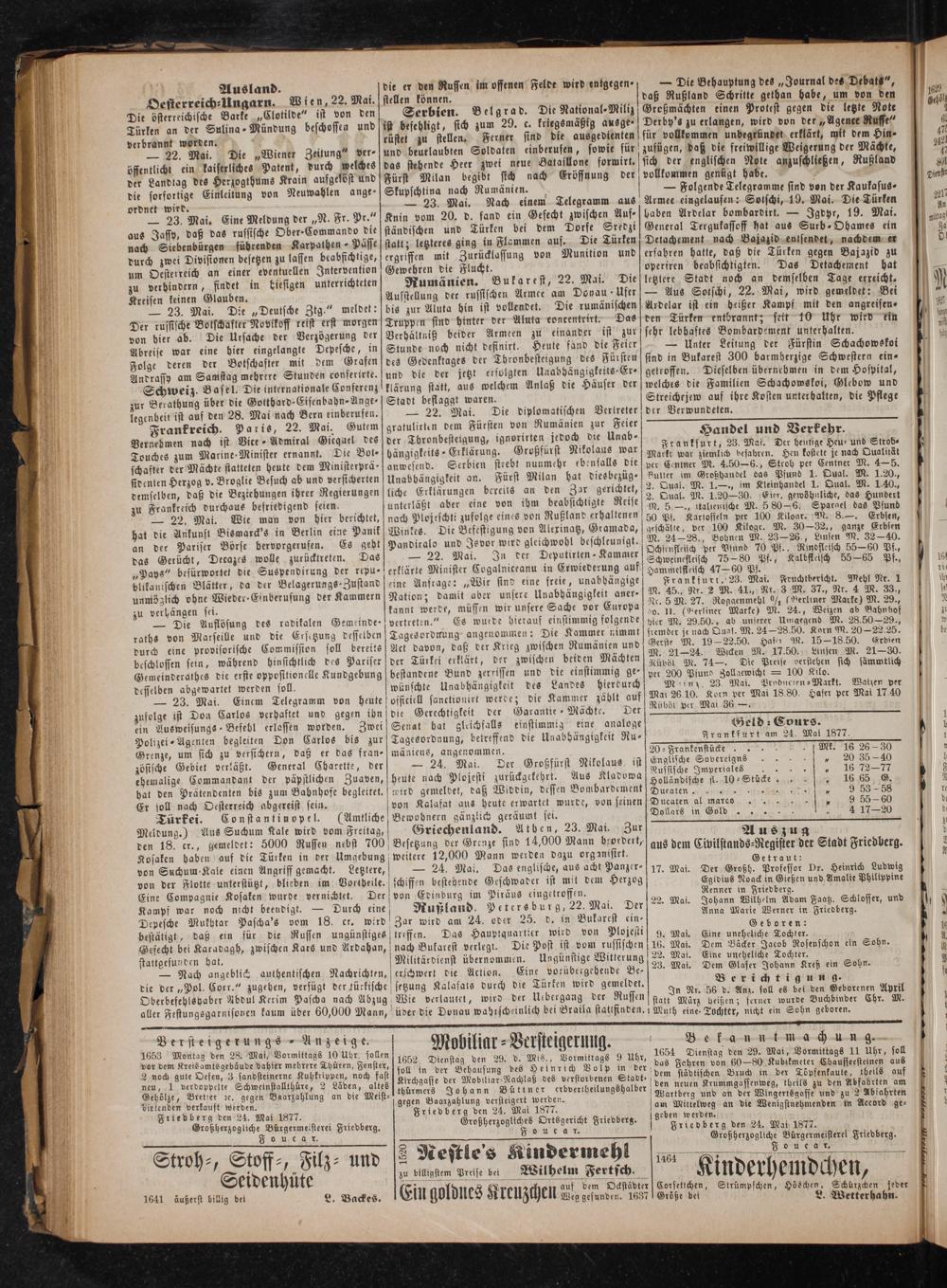 Rumänien. Bukarest, 22. Mai. Die Aufstellung der russischen Armee am Donau Ufer bis zur Aluta hin ist vollendet. Die rumänischen Truppen sind hinter der Aluta contentrirt. Das Verhältniß beider Armeen zu einander ist zur Stunde noch nicht definirt. Heute fand die Feier des Gedenktages der Thronbesteigung des Fürsten und die der jetzt erfolgten Unabhängigkeits⸗Er⸗ klärung statt, aus welchem Anlaß die Häuser der Stadt beflaggt waren.