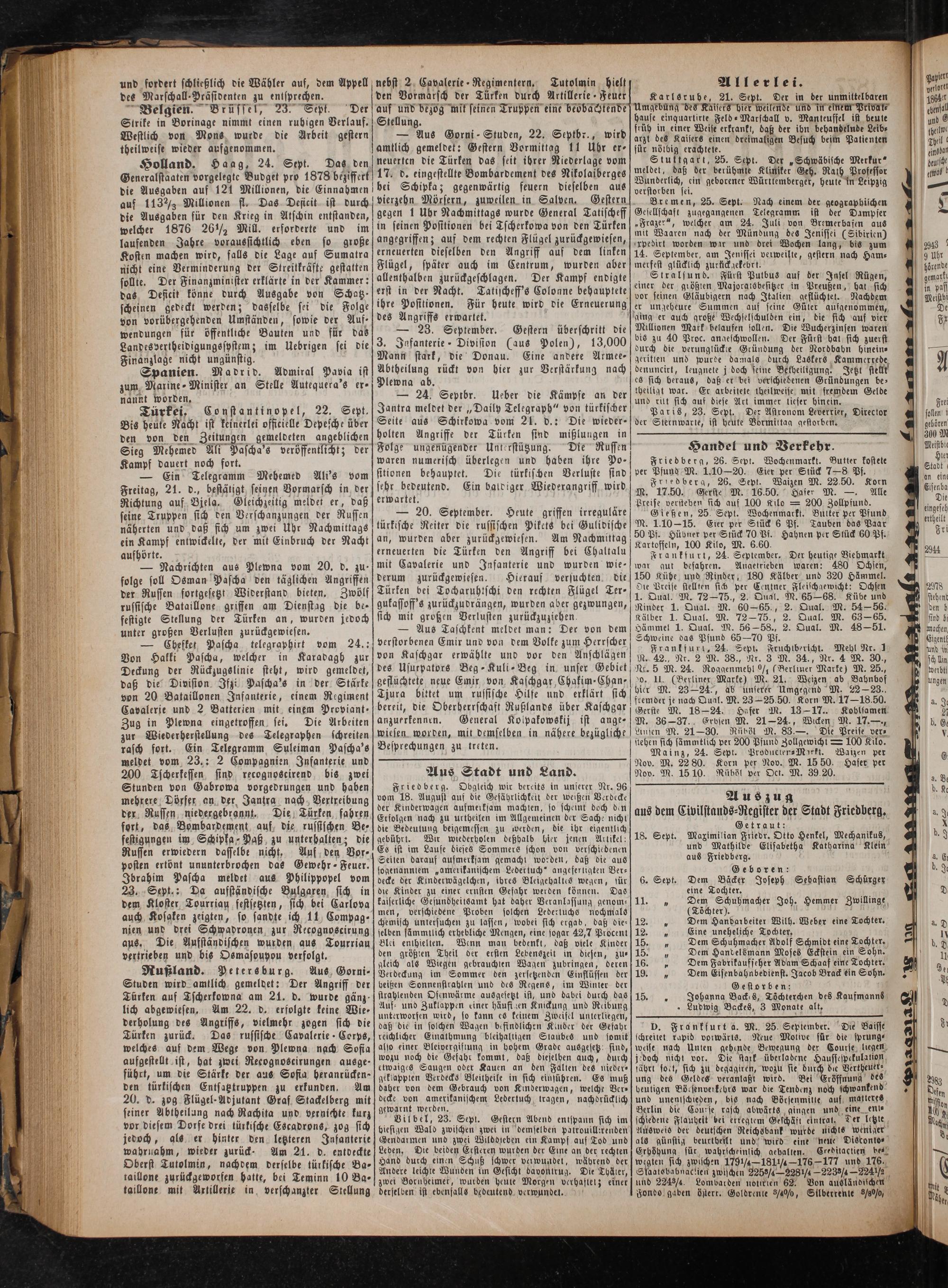 — Aus Gorni⸗ Studen, 22. Septbr., wird amtlich gemeldet: Gestern Vormittag 11 Uhr er⸗ neuerten die Türken das seit ihrer Niederlage vom 17. d. eingestellte Bombardement des Nikolaiberges hei Schipka; gegenwärtig feuern dieselben aus vierzehn Mörsern, zuweilen in Salven. Gestern gegen 1 Uhr Nachmittags wurde General Tatischeff in seinen Positionen bei Tscherkowa von den Türken angegriffen; auf dem rechten Flügel zurückgewiesen, erneuerten dieselben den Angriff auf dem linken Flügel, später auch im Centrum, wurden aber allenthalben zurückgeschlagen. Der Kampf endigte erst in der Nacht. Tatischeff's Colonne behauptete ihre Positionen. Für heute wird die Erneuerung des Angriffs erwartet.