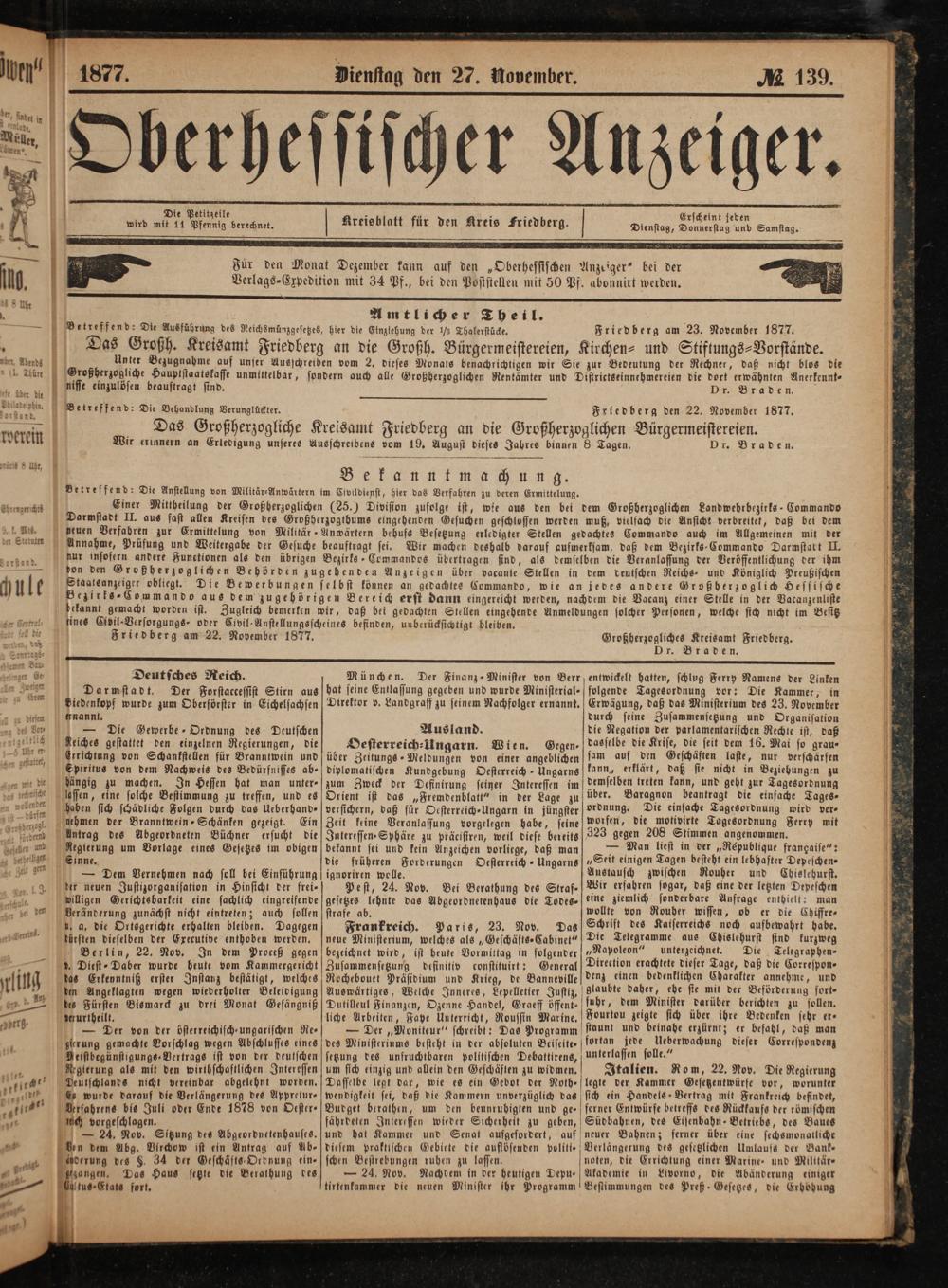Friedberg am 22. November 1877. Großherzogliches Kreisamt Friedberg.