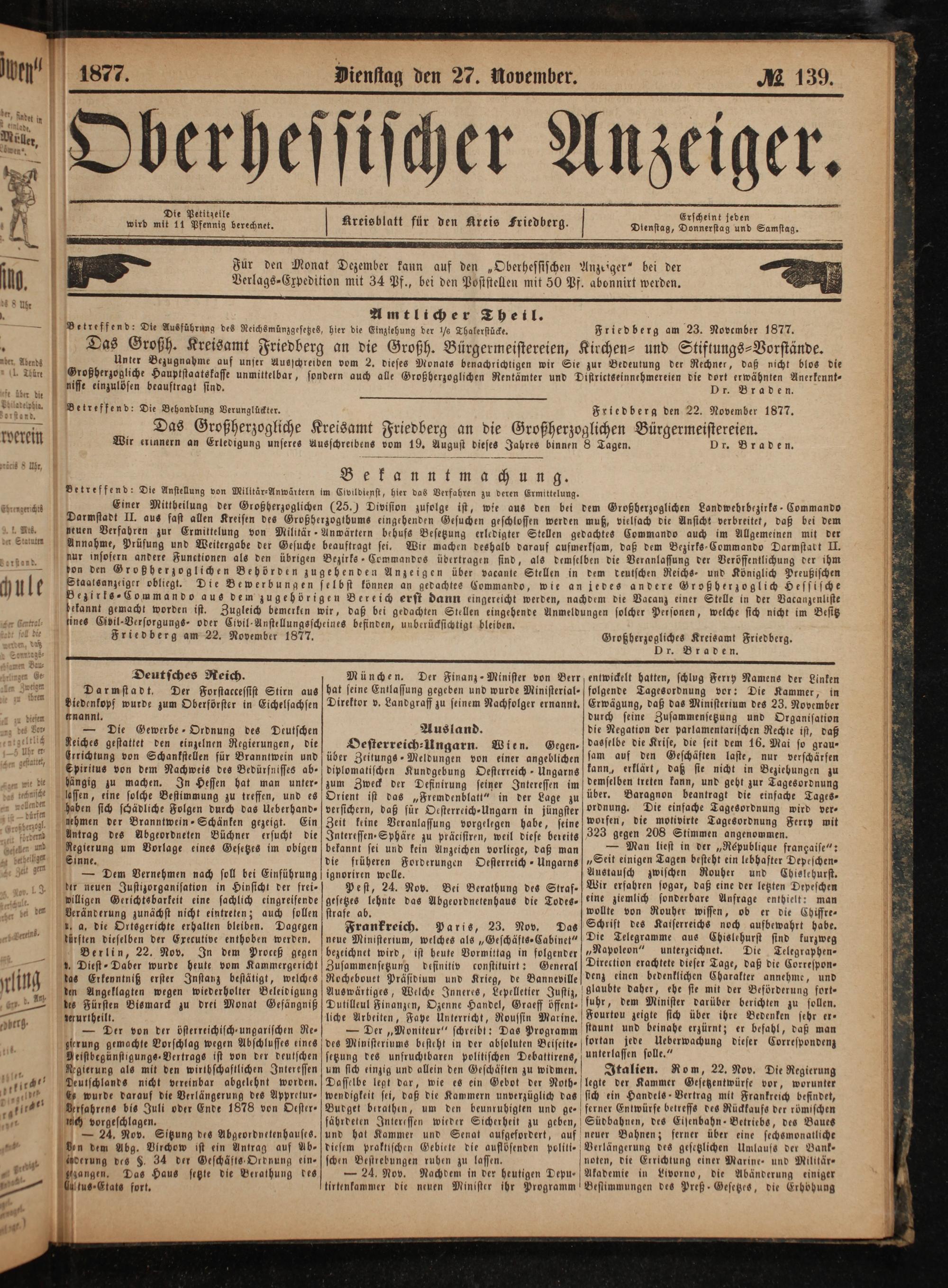 Die Petitzeil. N:; E int jed wird mit 11 e Kreisblatt für den Kreis Friedberg. Dienstag, ee dee Samstag. Für den Monat Dezember kann auf den„Oberhessischen Anzeiger“ bei der Verlags⸗Expedition mit 34 Pf., bei den Poststellen mit 50 Pf. abonnirt werden. Amtlicher Theil. a Betreffend: Die Ausführung des Reichsmünzgesetzes, hier die Einziehung der ½ Thalerstücke. Friedberg am 23. November 1877.