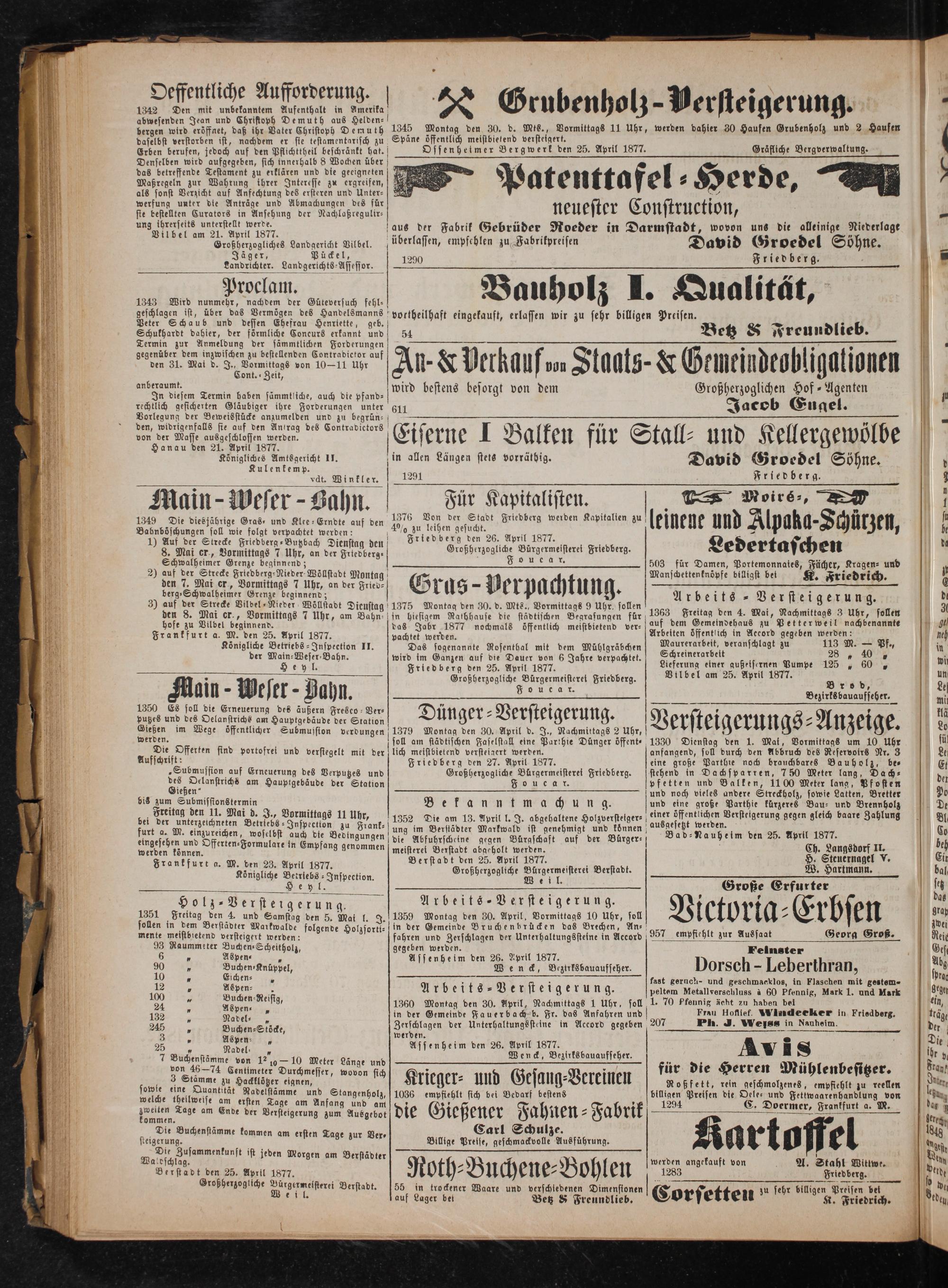 1330 Dienstag den 1. Mai, Vormittags um 10 Uhr anfangend, soll durch den Abbruch des Reservoirs Nr. 3 eine große Parthie noch brauchbares Bauholz, be⸗ stehend in Dachsparren, 750 Meter lang, Dach⸗ pfetten und Balken, 1100 Meter lang, Pfosten und noch vieles andere Streckholz, sowie Latten, Bretter und eine große Parthie kürzeres Bau- und Brennholz einer öffentlichen Versteigerung gegen gleich baare Zahlung ausgesetzt werden. Bad⸗Nauheim den 25. April 1877. Ch. Langsdorf II. H. Steuernagel V. W. Hartmann.