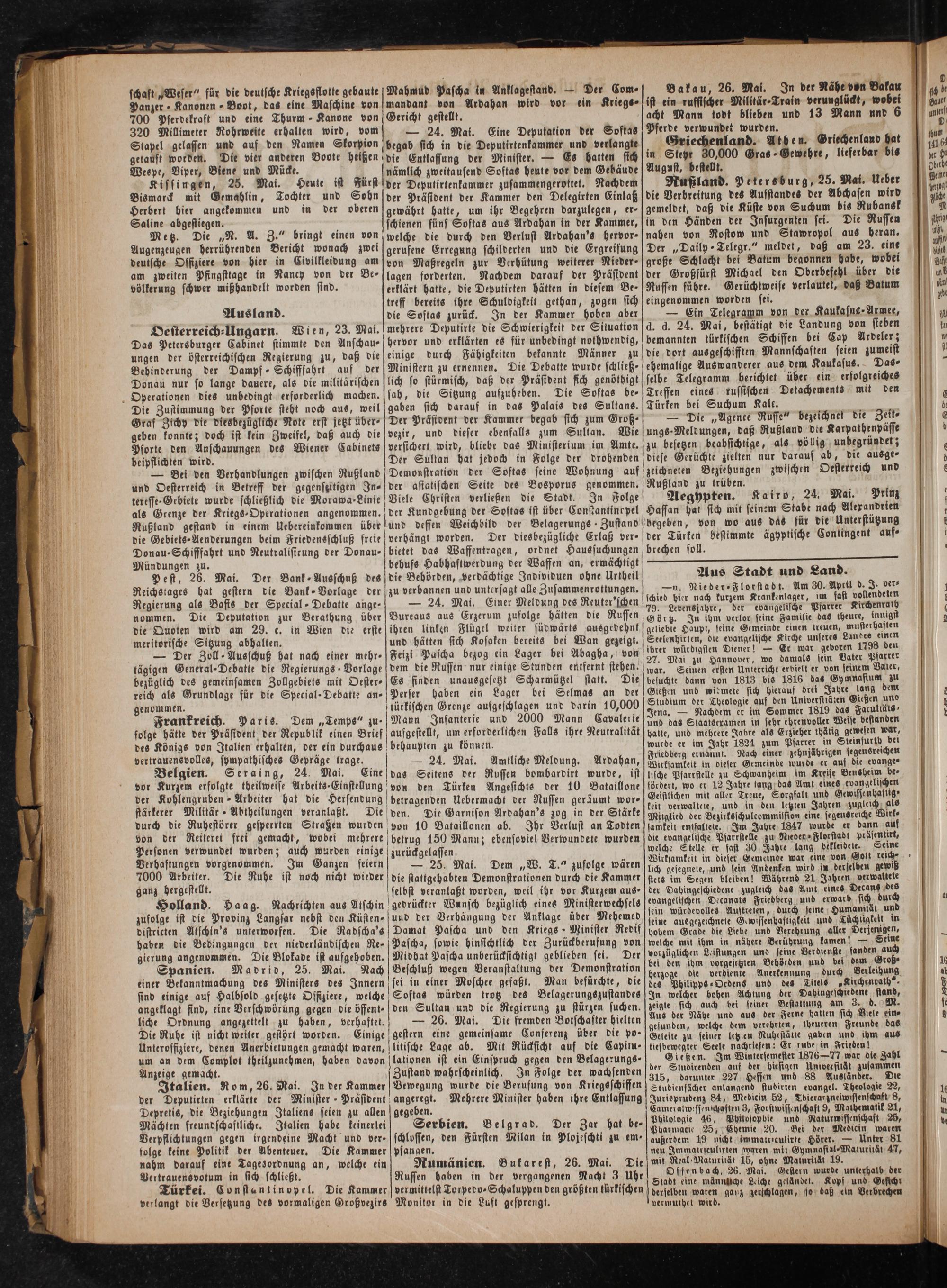 Rumänien. Bukarest, 26. Mai. Die Russen haben in der vergangenen Nacht 3 Uhr vermittelst Torpedo ⸗Schaluppen den größten türkischen Monitor in die Luft gesprengt.