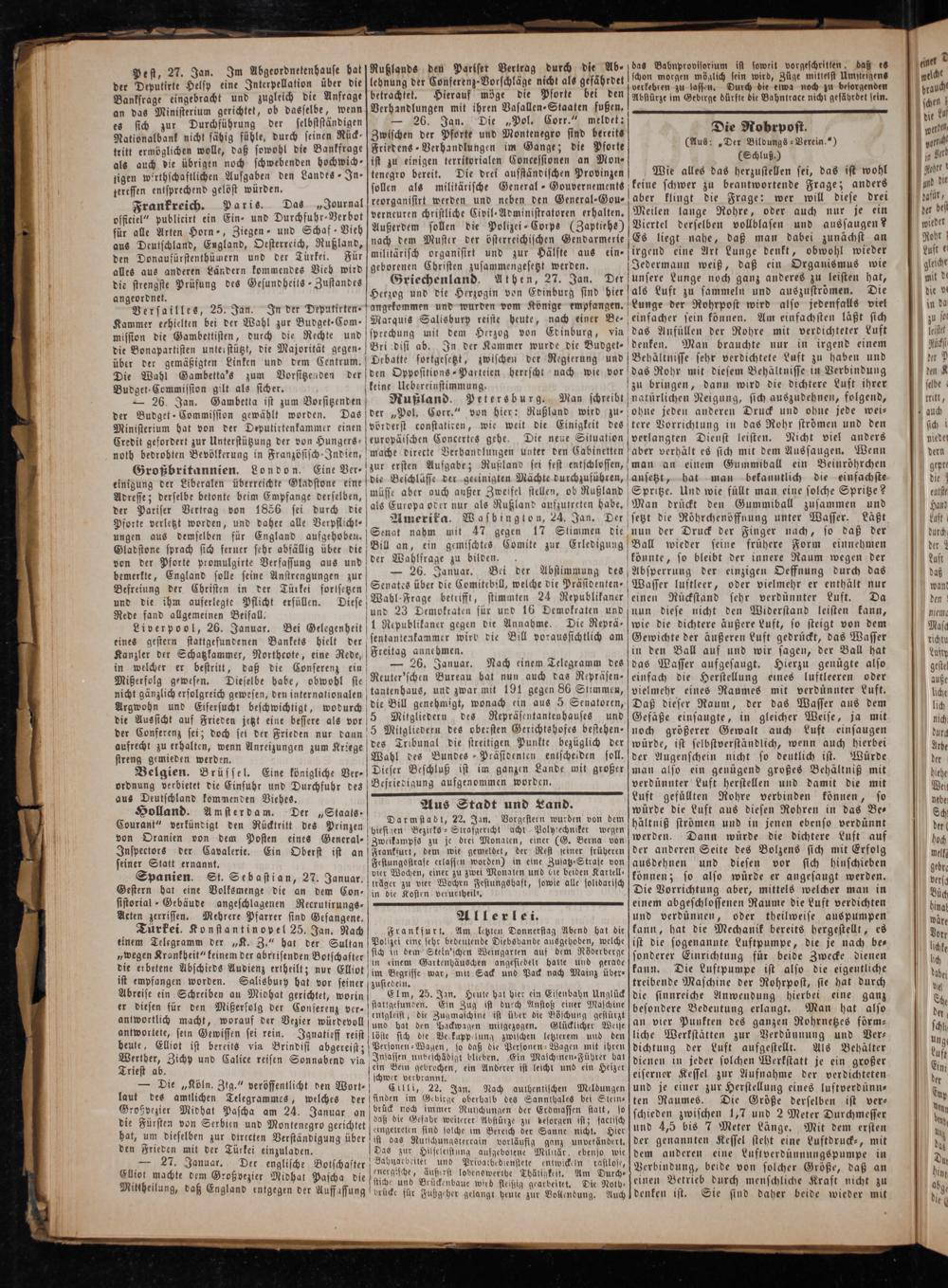 Griechenland. Athen, 27. Jan. Der unsere Lunge noch ganz anderes zu leisten hat, Herzog und die Herzogin von Edinburg sind hier als Luft zu sammeln und auszuströmen. Die angekommen und wurden vom Könige empfangen. Lunge der Rohrpost wird also jedenfalls viel Marquis Salisbury reiste heute, nach einer Be- einfacher sein können. Am einfachsten läßt sich sprechung mit dem Herzog von Edinburg, via das Anfüllen der Rohre mit verdichteter Luft Bri disi ab. In der Kammer wurde die Budget- denken. Man brauchte nur in irgend einem Debatte sortgesetzt, zwischen der Regierung und Behältnisse sehr verdichtete Luft zu haben und den Oppositions-Parteien herrscht nach wie vor das Rohr mit diesem Behältnisse in Verbindung zu bringen, dann wird die dichtere Luft ihrer