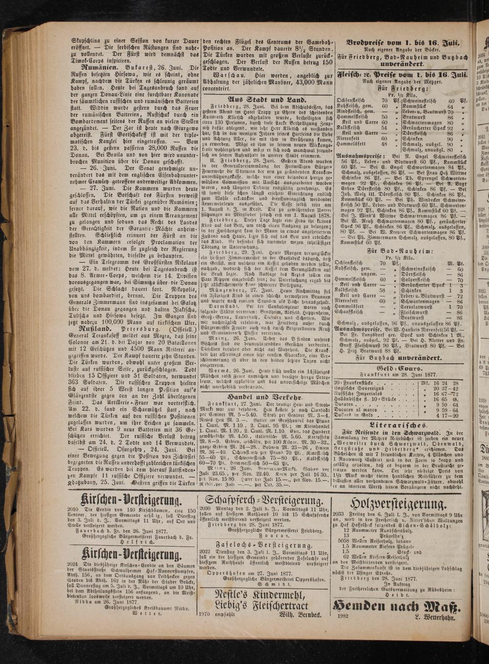 2010 Die Erndte von 140 Kirschbäumen, eira 150 Centner der hiesigen Gemeinde gehösig, soll Dienstag den 3. Juli d. J., Vormittags 11 Uhr, auf Ort und Stelle versteigert werden. Fauerbach b. Fr. den 26. Juni 1877. Großherzogliche Bürgermeisterei Fauerbach b. Fr. Hefe ch