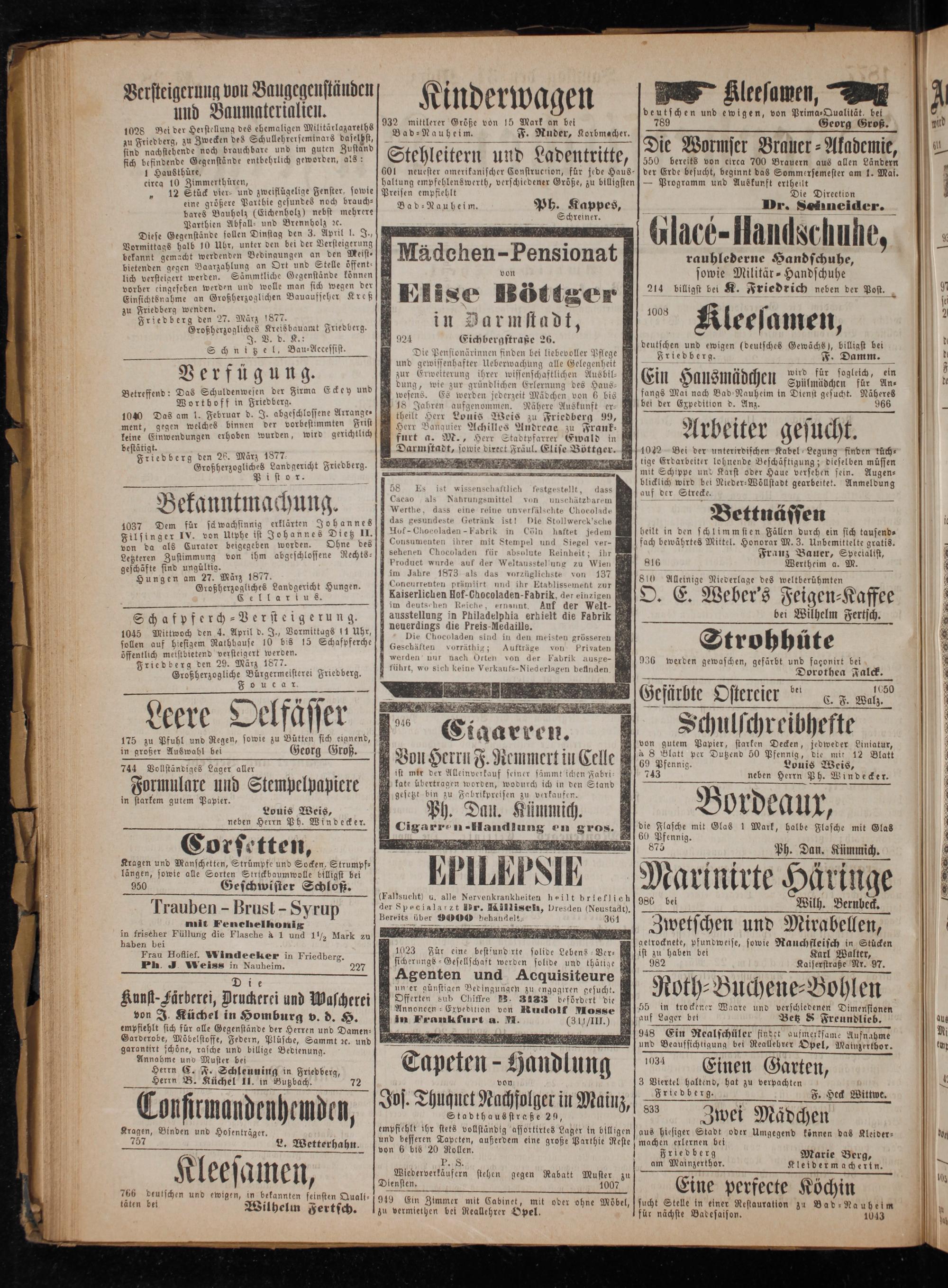 mit Fenchelhonik in frischer Füllung die Flasche à 1 und 1½ Mark zu haben bei Frau Hoflief. Windeeker in Friedberg. Ph. 1 Weiss in Nauheim.
