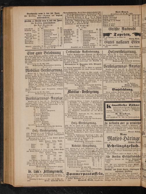 Schweinen Keil und Carre 64 Pf. gat f 19 N Eimahne Eine gute Belohnung Oeffentliche Aufforderung. Holzversteigerung. 1 Nachdem Großherzogliches Hofgericht der Provinz 1815 Montag den 3. Jun, Nachmittags 4 Uhr, fol! wird hiermit Demjenigen zugesichert, welcher den 8 Oberhessen den förmlichen Coneursprozeß über das be“ vor dem Hause 528 Weigrub en Steingan e 1 e ie n e en a e eee e eh 5 en] deutend überschuldete Vermögen des L. H. Strauß zu Parthie altes Bau- und Brennholz versteigert werden. städtischen Baumanlagen junge Obstbäumchen abge rochen Friedberg erkannt hat, so werden dessen Gläubiger hier. Friedberg den 31. Mai 1878. und angeschnitten hat, der unterzeichneten Behörde nam⸗ mt aufgefordert, ihre Forderungen und Ansprüche an Groshergeglcheh Betggescht Fieber n den 28 Mal 1878 denselben im Termin Fo ue a r. 1 3 Mi 18. 1878, Morgens Großherzogliche Bürgermeisterei Friedberg. Nittwoch den 18 ie 878, 0 N st f erun 8 An ei 0 1789 Denne bel Meidung Ausschlusses von der Masse bei unterzeich erste 9 9 7 3 9 11500 141 V ˖ netem Gericht anzumelden und sammt etwaigen Vorzugs— Dienstag den 4. Juni lfd. J., Vormittags 9 uh. Mobiliar⸗ er eigerung. rechten zu begründen. anfangend, läßt Unterzeichneter im Auftrag der Erben Di tag den 3. Juni lfd. J Vormittags 9 Uhr Gleichzeitig soll im Termin die Güte versucht und der verstorbenen Friedrich Stein's Wittwe dahier U 3 15 ol der Mobiliarnachlaß der verstorbenen] wenn dieselbe fehlschlagen sollte, Gläubigerausschuß und der Vorstadt folgende Gegenstände, als: Bettwerk, Weiß empfe ee C 175 Ritzel's Eheleute in der Behausung Masse⸗ Curator erwählt, sowie Beschlüsse über die Masse zeug, Tische, 1 Canapé, 1 Küchenschrank mit Glabaufsaß und s Friedri nde. dahier, bestehend in: gefaßt werden. In diesen Beziehungen werden die nicht 1 Kleiderschrank, Stühle, Waschbütten, wee E. des 15855 8 8 Aschen, 1 Fo Rohrstühlen, erschieneren und nicht genügend vertretenen Gläubiger 1 Dekalirmaschine, sowie noch sonstige Haus- und Küchen] Gläser 1 S 1 f. Glasaufsaßz 1 Nachttisch 1 Kleider den Beschlüssen der Mehrheit der erschlenenen und ge⸗ geräthe, gegen Baarzahlung versteigern. Sa 1 1 1 Bettw k, Weißze nügend vertretenen Gläubiger beitretend erachtet. Friedberg den 29. Mai 1878. An 1 J 0 3 5 gbchen eräth⸗ Friedberg den 27. Mai 1878 In Auftrag: masch n. s 52 1 9 5 Uhr 1 goldenen Kette 2 golde⸗ Großherzogliches Landgericht Friedberg. Mayer Schwarz, 1519 1 1 5 12 1 48 Pistor, Allwohn, 1774 Großherzoglicher Hoftaxa tor... „ 1 f 1818 Landrichter. Landgerichts-Assessor. 4 öffentlich meistbietend gegen Baarzahlung versteigert 1706 Empfehlung Da werden. i 212— 0 Je me Friedberg den 28. Mai 1878. N Mobiliar 5 Versteigerung. Einem geehrten Publikum widme ich hierdurch dis Nur un Großherzogliches Ortsgericht Friedberg.. g 5 ergebene Anzeige, daß ich fortwährend ein vollständigen Furcht“ 1817 Fou car. 1805 Nächsten Mittwoch den 5. Juni, von Vormittags Lager in Schuhen und Stiefeln sowohl für Damen als Seleß