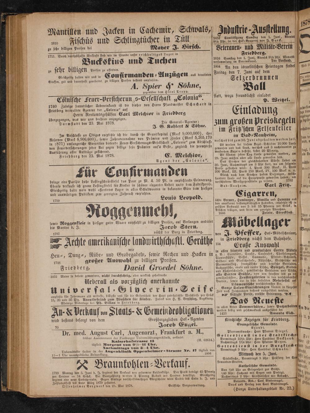 Tölnische Feuer-Versicherun s-Gesellschaft alone, en en ng 5 Weitzel 1740 Zufolge freundlicher Uebereinkunft ist die bisher von Herrn Pfandmeister Schuchard in 5 8 2 5 l Friedberg verwaltete Agentur der„Colonia“ auf E adun 0 usnttlson Herrn Rentamtsgehülfen Carl Melchior in Friedberg 11 9 f in dien übergegangen, was wir uns beehren anzuzeigen. 4 5 inmtrage Darmstadt den 23. Mai 1878. Die General- Agentur: zum Ir oßen Preiskegeln u bithe J. G. Kahlert& Söhne.; e a f A De im Fritz'schen Felsenkeller Im Anschlusse an Obiges empfehle ich die durch ihr Grundkapital(Mark 9,000,000), ihre in Bad⸗N 5 Reserven(Mark 8,906,600), sowie Jahreseinnahme von Prämien und Zinsen(Mark 5,205,170 in ad⸗Nauheim, Jann di in 1877) umfangreiche Garantien bietende Feuer- Versicherungs-Gesellschaft„Colonia“ zum Abschlusse Werbe es zum 30. Jun abgehalten werden soll. vid, v von Feuérversicherungen jeder Art gegen billige feste Prämien auf's Beste, zugleich die prompteste Es werden bei diesem Kegel⸗Schieben 10000 Loose 2 8 geworfen und das Loos, welches aus 3 nacheinander zu Ausführung aller Austräge zusichernd. 4 werfenden Kugeln besteht, kostet 20 Pfennig. 1 stagl. ö Friedberg den 23. Mai 1878. C. Melchior, Es können jeden Tag Loose geworfen werden, am als De A d 8 l 1 727 29. Juni müssen aber alle Loose geworfen sein. gent er„ Eolon fa“. Das Stechen der gleichstehenden Würfe findet am äh
