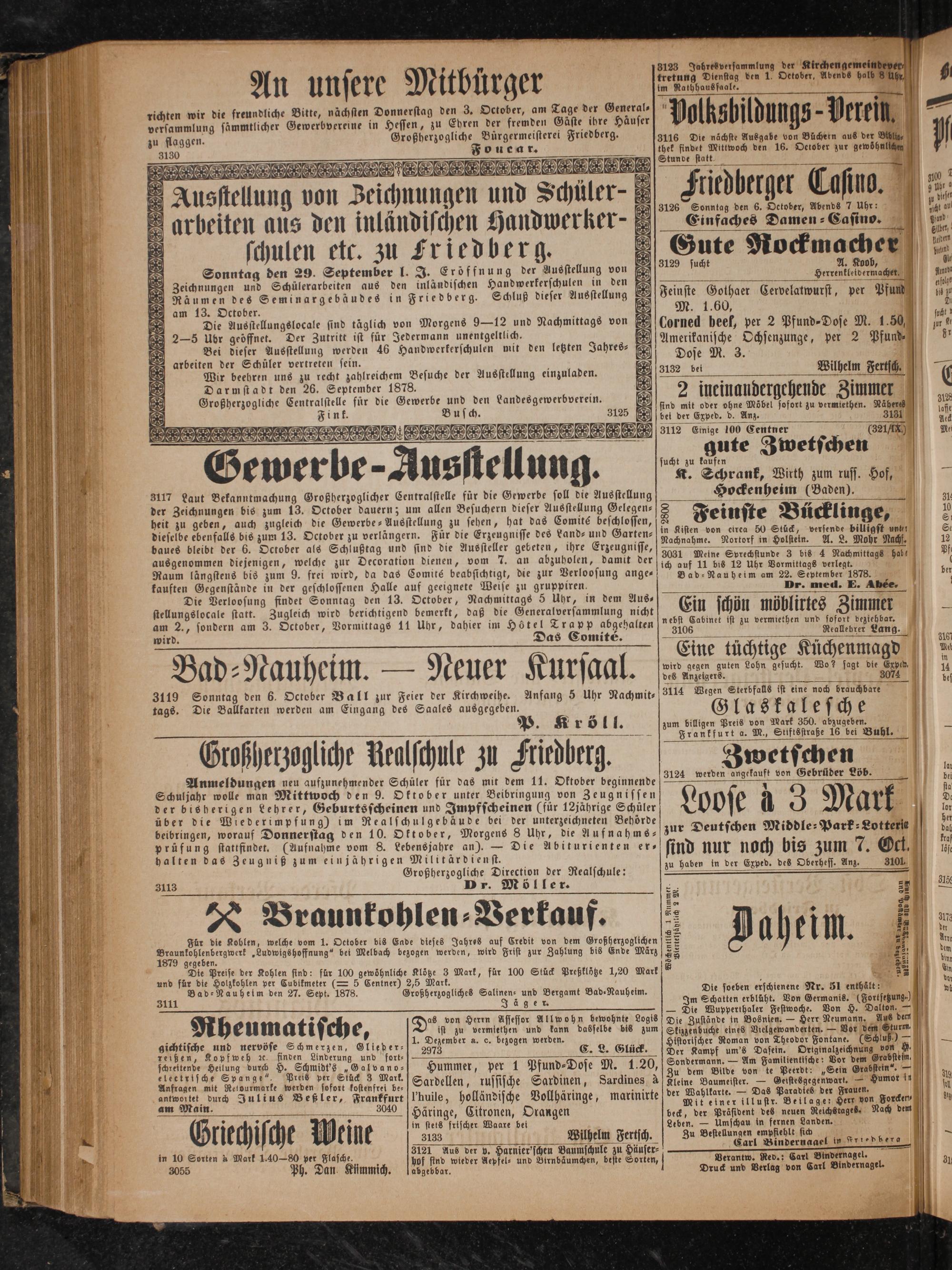 Sonntag den 29. September l. J. Eröffnung der Ausstellung von Zeichnungen und Schülerarbeiten aus den inländischen Handwerkerschulen in den Räumen des Seminargebäudes in Friedberg. Schluß dieser Ausstellung am 13. October.