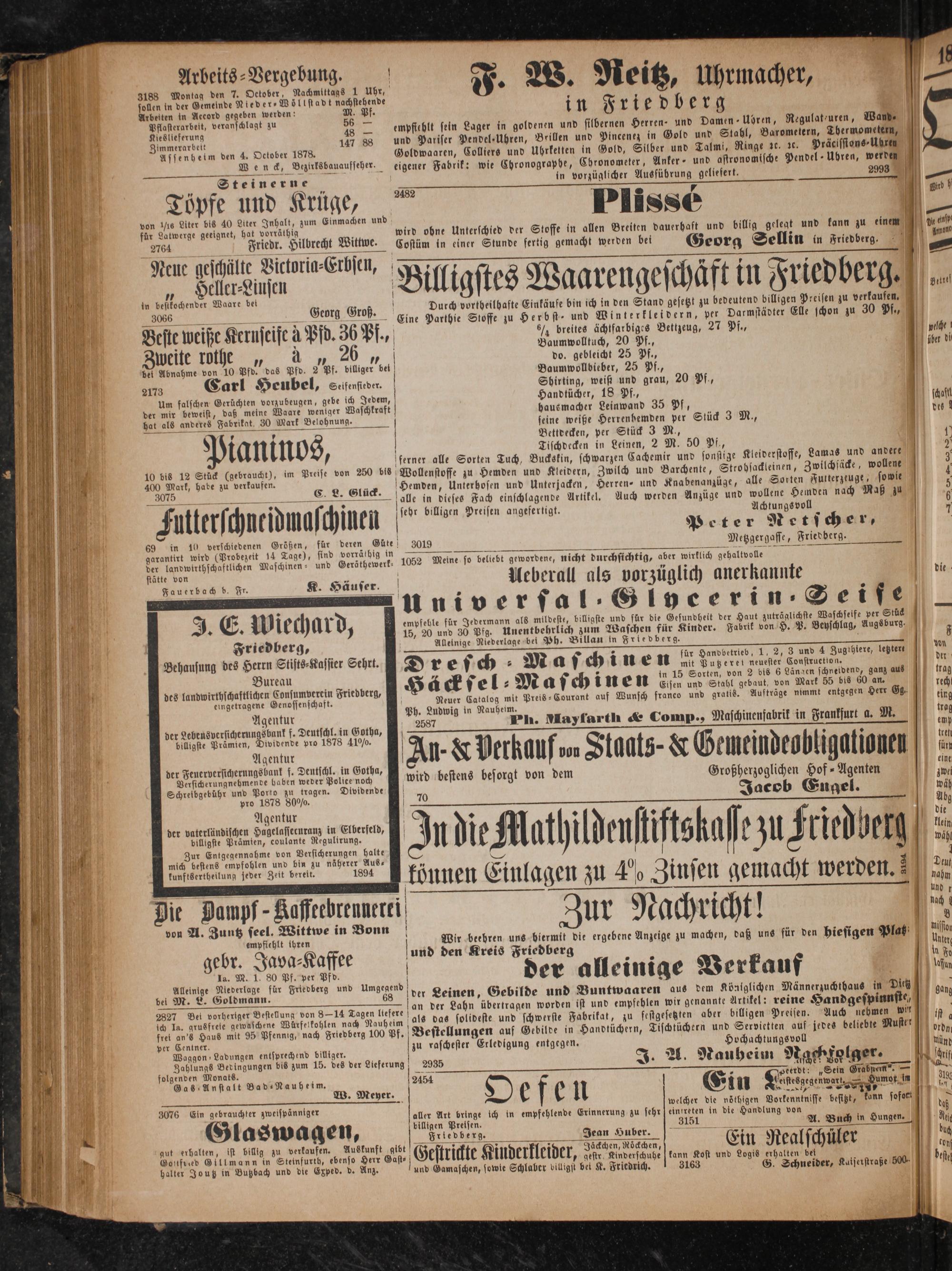 r Gemeinde Nieder-Wöllstadt nachste ende 1 1 —4 5 Accord gegeben werden: 5 15 9. 1 n F 1 ˖ E d b E* 9 Pflasterarbeit, veranschlagt zu 56— 1 8 90 a Kieslieferung 488 empfiehlt sein Lager in goldenen und silbernen Herren- und Damen Uhren, Regulat-uren, Wand, Zimmerarbeit 147 88 und Pariser Pendel-Uhren, Brillen und Pincenez in Gold und Stahl, Barometern, Thermometern, Assenheim den 4. October 1878. Goldwaaren, Colliers und Uhrketten in Gold, Silber und Talmi, Ringe ꝛc. ꝛc. Präcisstons⸗Uhren 1 N. neck, Bezüksbauaufseher. eigener Fabrik: wie Chronographe, Chronometer, Anker und astronomische Pendel- Uhrea, werdet Steinerne in vorzüglicher Ausführung geliefert. 2993 Ruf, dnl 2482 g Töpfe und Krüge, Plissee von ¼16 Liter bis 40 Liter Inhalt, zum Einmachen und für Latwerge geeignet, hat vorräthig.. wird ohne Unterschied der Stoffe in allen Breiten dauerhaft und billig gelegt und kann zu einem 2764 Friedr. Hilbrecht Wittwe. Costüm in einer Stunde fertig gemacht werden bei Georg Sellin in Friedberg.