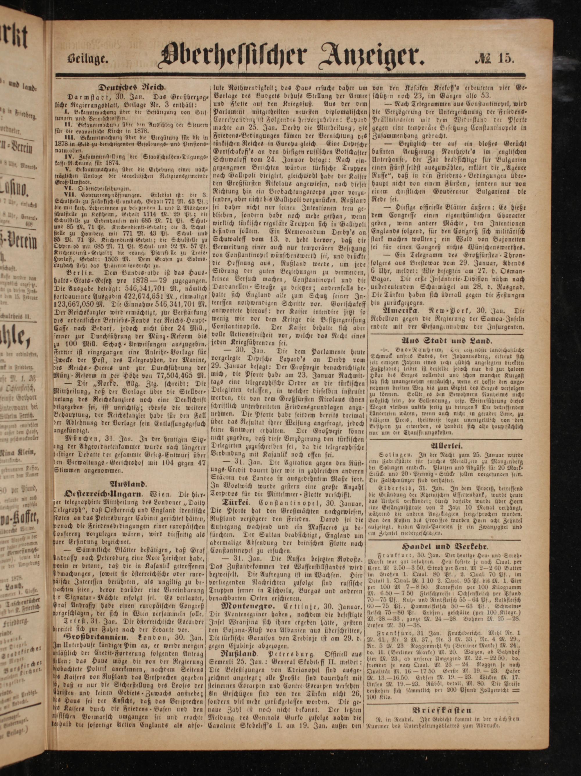 von Constantinopel wünschenswerth sei, und drückte die Hoffnung aus, Rußland werde, um jede solgers aus Brestowae vom 29. Januar, Abends Dem Bundesrathe ist das Haus- Störung der guten Beziebungen zu vermeiden, 6 Uhr, meldet: Wie besetzten am 27. d. Oeman- halts- Etats Gesetz pro 1878— 79 zugegangen. keinen Versuch machen, Constantinopel und die] Bazar. 1. N Die Ausgabe beträgt: 546,341,701 M., nämlich Dardanellen Straße zu besetzen; anderpfalls be- unbeteutendem Scharmützel am 28. d. Rasgrad. fortdauernte Ausgaben 422,674,651 M., cinmalige halte sich England ale zum Schutz seiner In- Die Türken haben sich überall gegen die Festungen