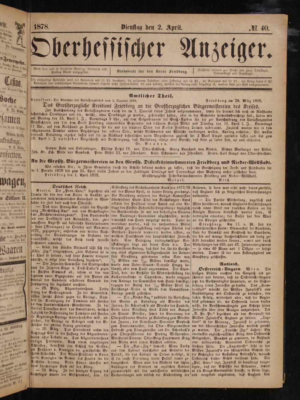 Quartal dieses Jahres aufgenommenen, sowie die hiermit sich noch im Rückstande welche, ohne Ortebürger zu werden, geheirathet haben, aber in der Gemeinde heimathsberechligt sind, haben wir J., Vormittags 9 Uhr, auf dem Selzerbrunnen bei Groß Karben für die zur Aue sschwörung des Verfassungseides reise Friedberg einverleibten Gemeinden des früheren Kreises Vilbel und Dienstag den 16. 11 Uhr, auf dem Ratbhause zu Friedberg für die aus den früberen Orten des Kreises Friedberg Termin anberaumt.