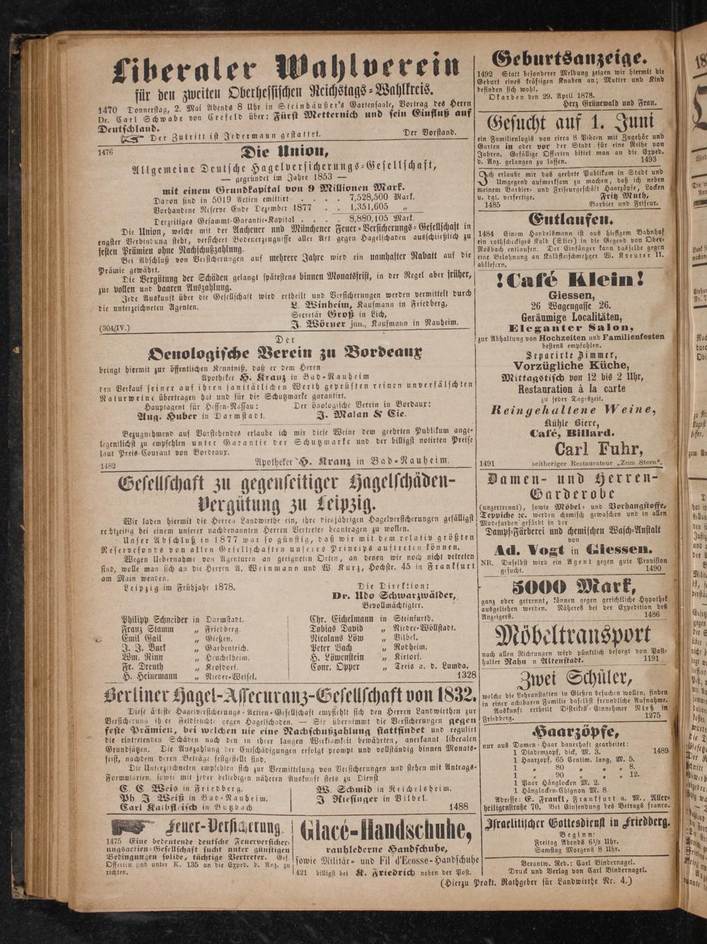 Geburt eines kräftigen Knaben an; Mutter und Kind 5 befinden sich wohl. Okarben den 29. April 1878. Herz Grünewald und Fran. unf Gesucht auf 1. Juni ein Familienlogis von eirea 8 Pidcen mit Zugehör und Garten in oder vor der Stadt für eine Reihe von Jahren. Gefällige Offerten bittet man an die Exped.— d. Anz. gelangen zu lassen. 1493 Aird ch erlaube mir das geehrte Publikum in Stadt und. Umgegend aufmerksam zu machen, daß ich neben 955 meinem Barbier- und Friseurgeschäft Haarzöpfe, Locken Die e u. dgl. verfertige. Fritz Muth, Am 1485 5 Barbier und Frsseur,—— Eutlaufen. 1484 Einem Handelsmann ist aus hiefigem Bahnhof ein rothscheckiges Kalb(Stler) in die Gegend von Ober⸗ Rosbach entlaufen. Der Einfänger kann dasselbe gegen Bur! eine Belohnung an Kalbfleischmetzeer W. Kreuter II. nathun blk 1— 1 0* 8 7 Cafe Klein! Giessen, 357 26 Wagengasse 26. 1 Geräumige Localitäten, Eleganter Salon, zur Abhaltung von Hochzeiten und Familienfesten Noc bestens empfohlen. 0 dure Separirte Zimmer, Db Vorzügliche Küche, Mittagstisch von 12 bis 2 Uhr, Restauration à la carte 8 zu jeder Tageszeit. Rein gehallene Meine,„ Kühle Viere, 1 E Café, Billard., 1491 seitheriger Restaurateur„Zum Stern“. Damen- und Herren-— — 1 11 Garderobe 5 (unzertrennt), sowie Möbel und Vorhangstoffe, bal ih Teppiche ꝛc. werden chemisch gewaschen und in allen ful Modefarben gefärbt in der. 410 N n Dampf⸗Färberei und chemischen Wasch⸗Anstalt 90 von 4 i Ad. Vogt in Giessen. NB. Daselbst wird ein Agent gegen gute Provision 5 gesucht. 1490 25 9 4 e 5000 Mark... ganz oder getrennt, können gegen gerichtliche Hypothek 1e ausgeliehen werden. Näheres bei der Expedition des„ Anzeigers. e e Giseg Möbeltransport 1 der .* ran por 9 lber nach allen Richtungen wird pünktlich besorgt von Post⸗ lich/ haller Rahn en Altenstade. 1191 beg n 1 8 N N 12 J 1 ffn 5 1 Zwei Schuler, 140565 welche die Lehranstalten in Gießen besuchen wollen, finden in einer achtbaren Familie daselbst freundliche Aufnahme. ö Auskunft ertheilt Distrikts-Einnehmer Nieß in d Frledberg. 1275.
