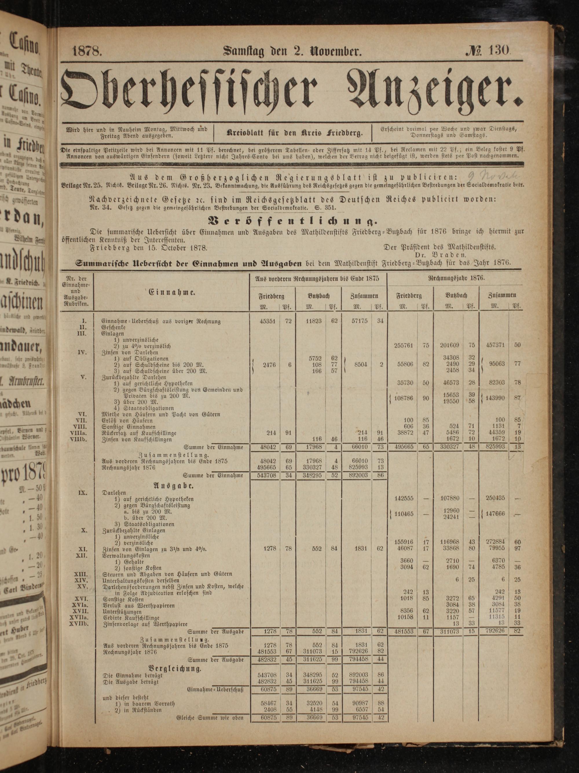 Die summarische Vebersicht über Einnahmen und Ausgaben des Mathildenstifts Friedberg-Butzbach für 1876 bringe ich hiermit zur 4 offentlichen Kenntniß der J Meressenten. 4 Friedberg den 15. October 1878.