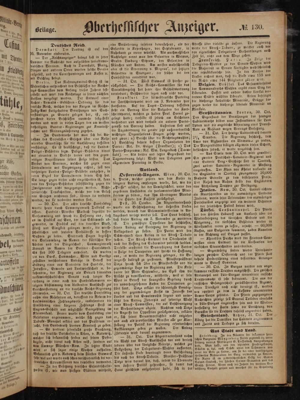 I Fatischen Vereinen. Auch in Darmstadt, Mainz, München und Andere. Am meisten wahrscheinlich Delegirten⸗Wablen zu den Senats-Wahlen wird Atitbhn Bingen und anderen Orten wurden solche Vereine aber ist die Ernennung v. Magnus', des jetzigen die Majorität im Senate künstighin wahrscheinlich n bufgelöst, und die Correspondenzen und Kassen 1c. Gesandten in Stuttgart, der früher bei den eine republikanische seizn. In den Kreisen der in nit Beschlag belegt. Hansestädten accreditirt war. Linken rechnet man, daß die Linke etwa 155 und a Berlin. Das Nahrungsmittel-Gesetz ist im— 31. Oct. Fürst Bismarck ist hierher zu-[die Rechte wa 144 Mitglieder zählen werd. Wesentlichen entsprechend den Beschlüssen der Reichs- rückgekehrt.— Die Reichs-Commission für das Belgien. Brüssel. Das Gesammtresultat sags-Commisston vom Anfang dieses Jahres fest. Socialistengesetz hat heute ihre Geschäftsordnung der Communalraths Wahlen ergibt einen Sieg der 53 gestellt und wird dem Reichstage in seiner nächsten vereinbart; Beschwerden lagen noch nicht vor. Liberalen. Hasselt und andere bisher klerikal ver- Dession vorgelegt werden. Der Entwurf einer Frankfurt. Der südwestdeutsche Parteitag tretene Städte wählten Liberale. Arlon beseitigte * le, Rechts Anwalts Gebühren Ordnung für das der Fortschrittapartei wird am 3. November hier die bisherige katbolische Minorität, Brügge da