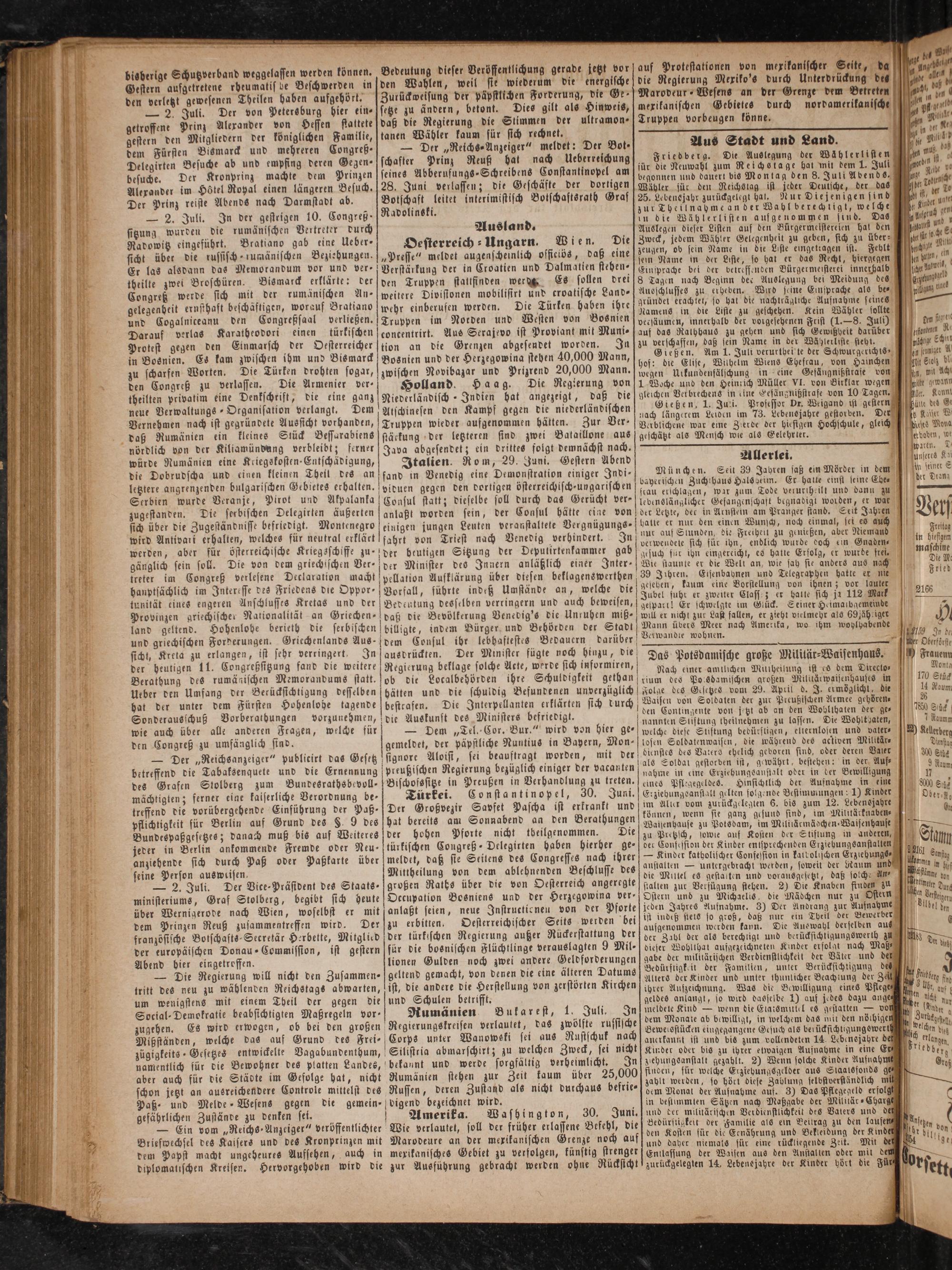 Bischofssitze in Preußen in Verhandlung zu treten. Türkei. Constantinopel, 30. Juni. Der Großvezir Sapfet Pascha ist erkrankt und hat bereits am Sonnabend an den Berathungen der hohen Pforte nicht tbeilgenommen. Die türkischen Congreß- Delegirten haben hierher ge— meldet, daß sie Seitens des Congresses nach ihrer Mittheilung von dem ablehnenden Beschlusse des großen Raths über die von Oesterreich angeregte Occupation Bosniens und der Herzegowina ver⸗ anlaßt seien, neue Instructicneu von der Pforte zu erbitten. Oesterreichischer Seits werden bei der türkischen Regierung außer Rückerstattung der für die bosnischen Flüchtlinge verauslagten 9 Mil- lionen Gulden noch zwei andere Geldforderungen geltend gemacht, von denen die eine älteren Datums ist, die andere die Herstellung von zerstörten Kirchen und Schulen betrifft. Rumänien Bukarest, 1. Juli. In
