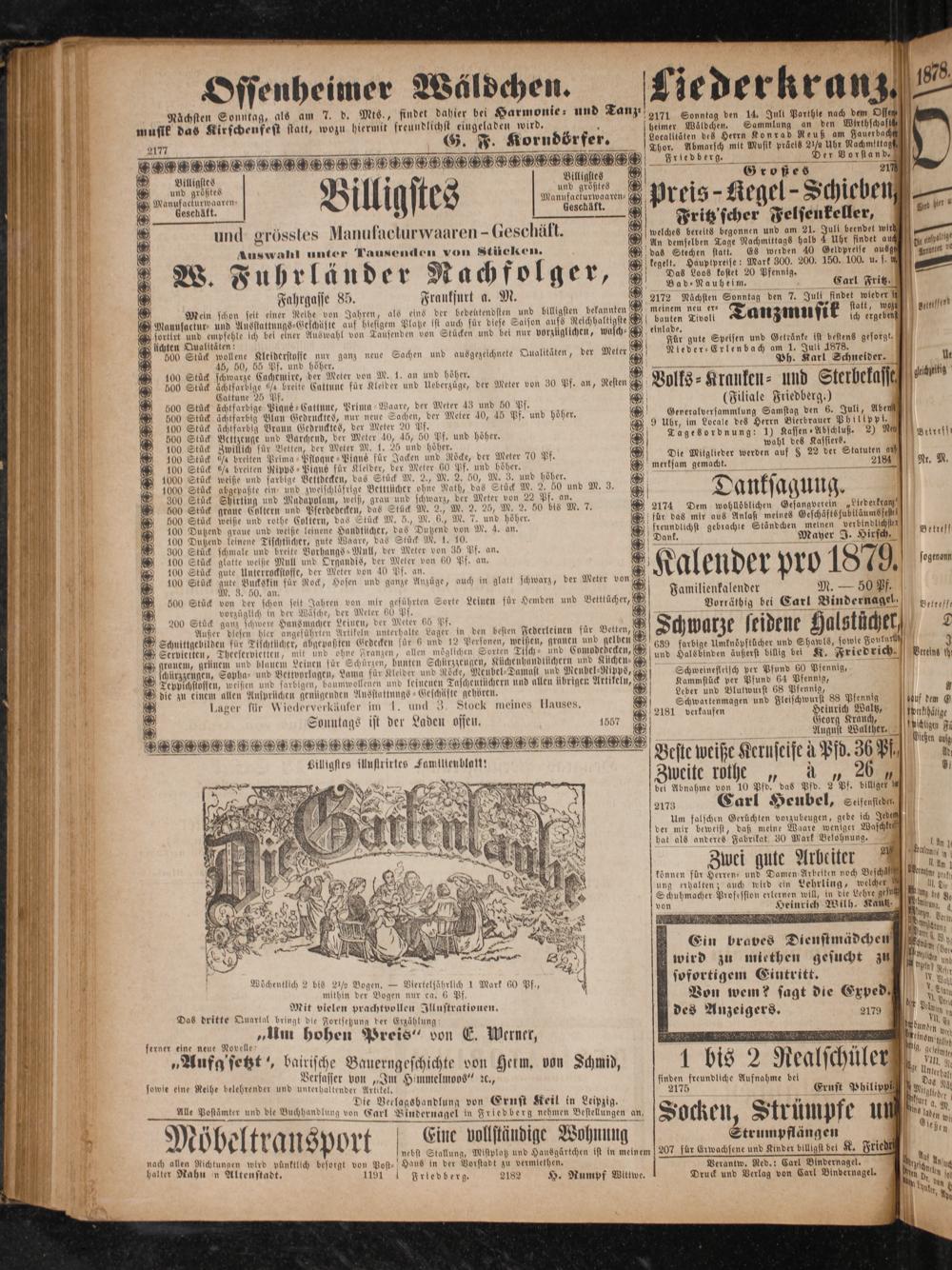 das Stechen statt. Es werden 40 Gelppreise ausge, enen ve kegelt. Hauptpreise: Mark 309. 200. 150. 100. u. s.— Das Loos kostet 20 Pfennig. 1 1 Bad⸗Nauheim.. Carl Fritz. 2172 Naͤchsten Sonntag den 7. Juli findet wieder m meinem neu er⸗ 0 statt, wol Heltesse bauten Tivoli Tanzmusi ich ergeben einlade. Für gute Speisen und Getränke ist bestens gesorgt. Nleder⸗Erlenbach am 1. Juli 1878. . Ph. Karl Schneider. U 21 4 I be Volks⸗Kranken⸗ und Sterhekasses“ (Filiale Friedberg.) 1 Oeneralversammlung Samstag den 6. Jul, Abensf 9 Uhr, im Locale des Herrn Bierbrauer Philippi.“ Tagesordnung: 1) Kassen⸗Abschluß. 2) Ni Hetref. wahl des Kassiers. 104 Die Mitglieder werden auf§ 22 der Statuten auß merksam gemacht. A Nr. M. ank Danksagung. 2174 Dem wohlloͤblichen Gesangverein„Lieder kram“ für das mir aus Anlaß meines Geschäftsfublläums fes freundlichst gebrachte Ständchen meinen verbindlichstez Betreff Dank. 5 Mayer J. Hirsch. N Kalender pro 1879 ö sogenann Kalender pro 5 Familienkalender M.— 50 Pf. Vorräthig bei Carl Bindernagel- 9,7%