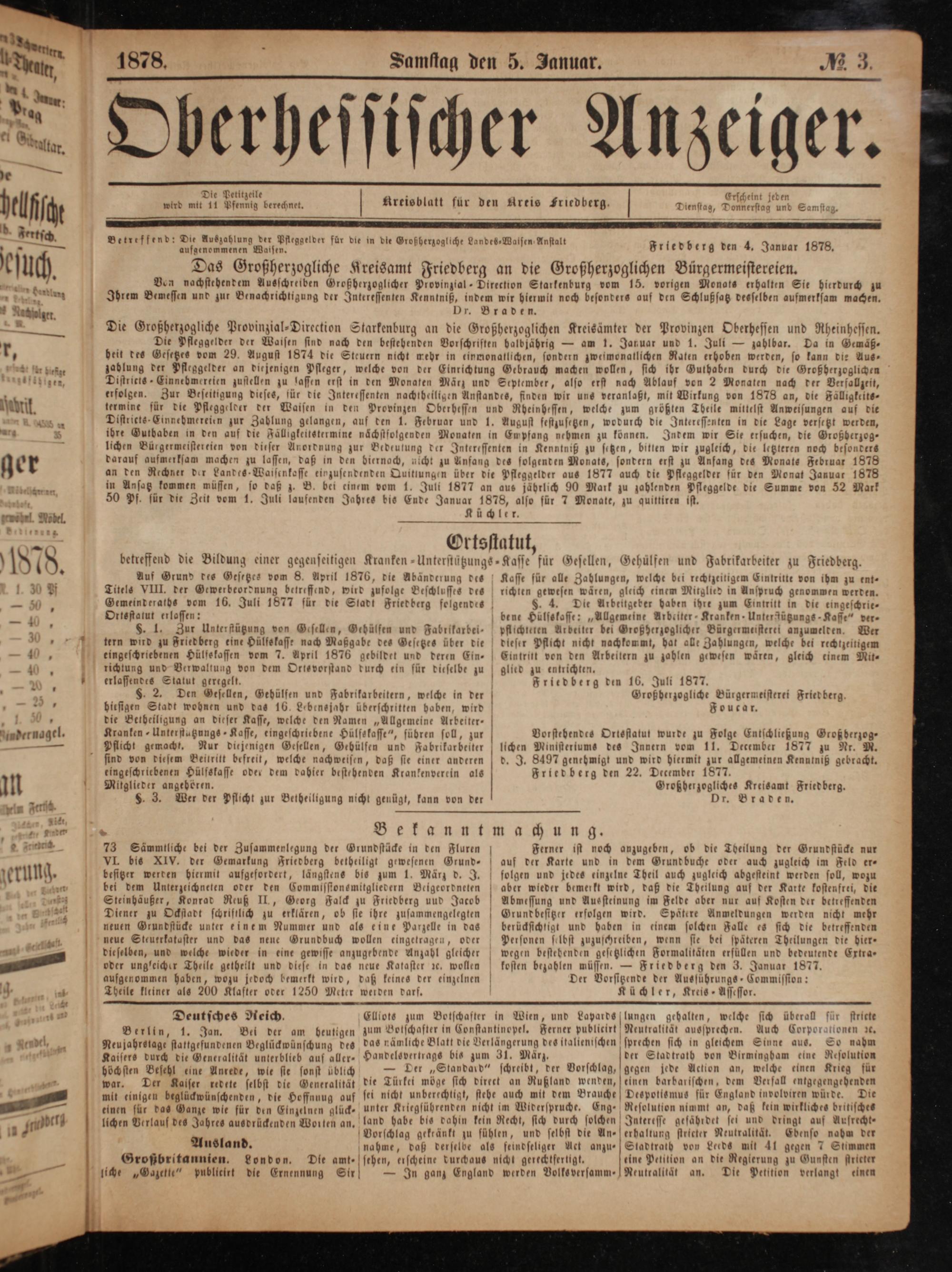 pflichteten Arbeiter bei Großherzoglicher Bürgermeisterei anzumelden. Wer dieser Pflicht nicht nachkommt, hat alle Zahlungen, welche bei rechtzeitigem Eintritt von den Arbeitern zu zahlen gewesen wären, gleich einem Mit⸗ glied zu entrichten. Friedberg den 16. Juli 1877. Großherzogliche Bürgermeisterei Fried berg. Foucar.