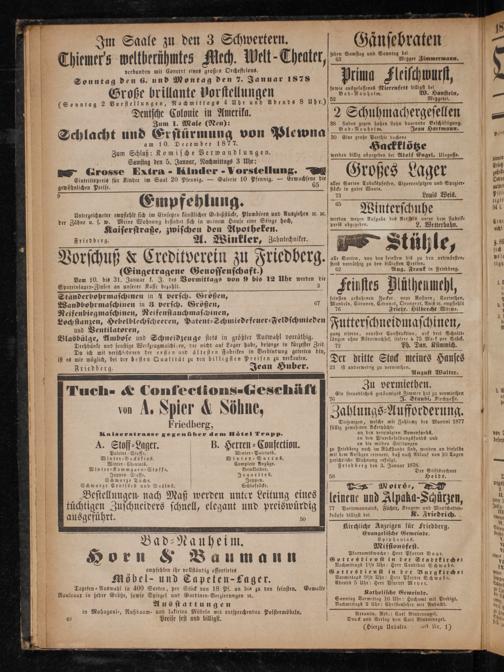 Diejenigen, welche mit Zahlung der Martini 1877 fällig gewesenen Ackerpächte an den vereinigten Armenfonds, en den Pfarrbesoldungsfonds und an die milden Stiftungen zu Friedberg noch im Rückstande sind, werden an dieselbe mit dem Anfügen erinnert, daß nach Ablauf von 10 Tagen gerichtliche Mahnung erfolgt. Friedberg den 3. Januar 1878. Der ie Heidt.