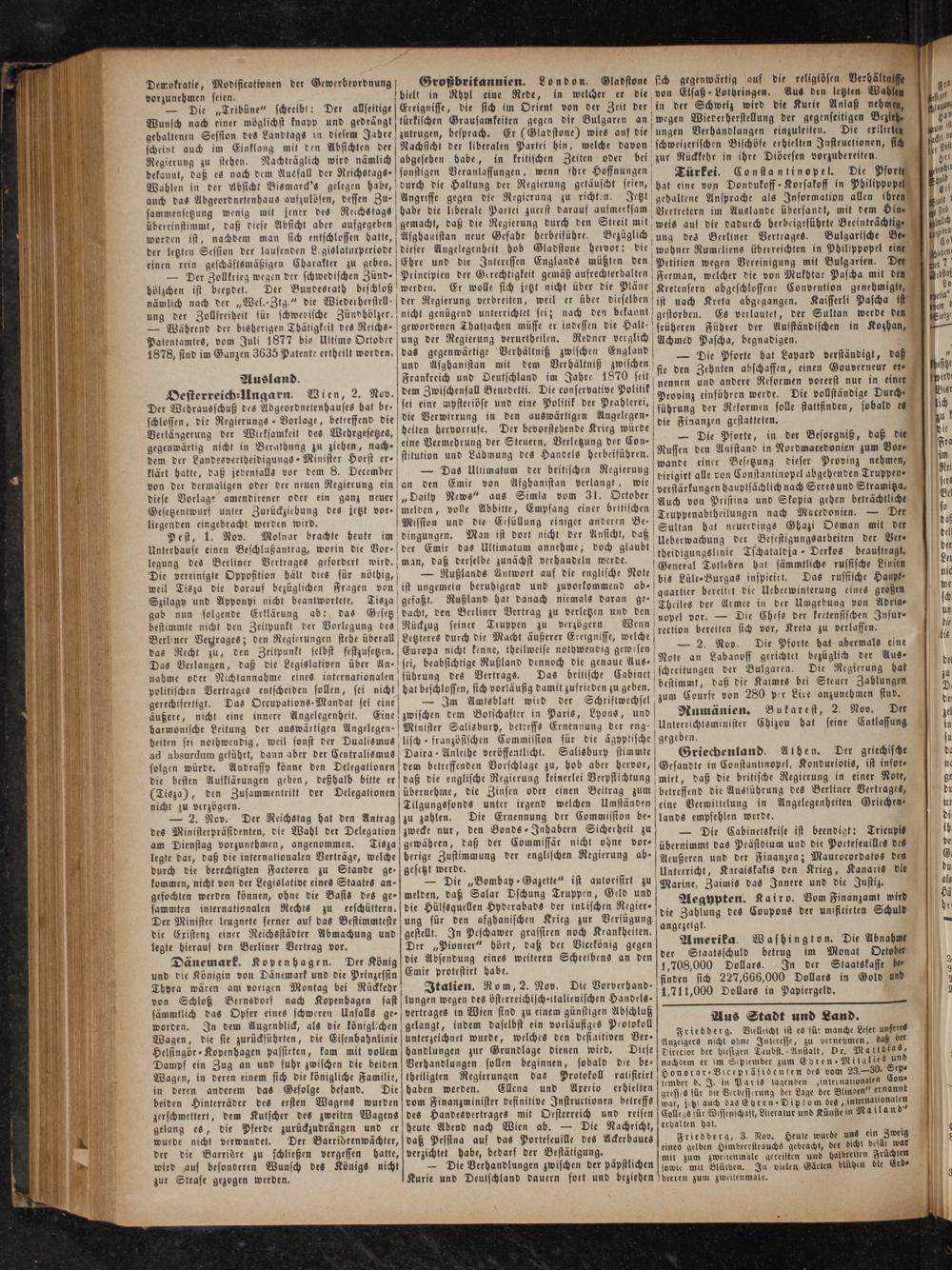Patentamtes, vom Juli 1877 bie Ultimo October 1878, sind im Ganzen 3635 Patente ertheilt worden. Ausland. Oesterreich⸗UUngarn. Der Webrausschuß des Abgeordnetenhauses hat be- schlossen, die Regierungs- Vorlage, betreffend die Verlängerung der Wirksamkeit des Wehrgesetzes, gegenwärtig nicht in Berathung zu ziehen, nach dem der Landesvertheidigungs⸗Minister Horst er- klärt hatte, daß jedenfalls vor dem 8. December von der dermaligen oder der neuen Regierung ein diese Vorlage amendirener oder ein ganz neuer Gesetzentwurf unter Zurückziehung des jetzt vor⸗ liegenden eingebracht werden wird. Pest, 1. Nov. Molnar brachte beute im Unterbause einen Beschlußantrag, worin die Vor- legung des Berliner Vertrages gefordert wird. Die vereinigte Oppofition hält dies für nöthig,