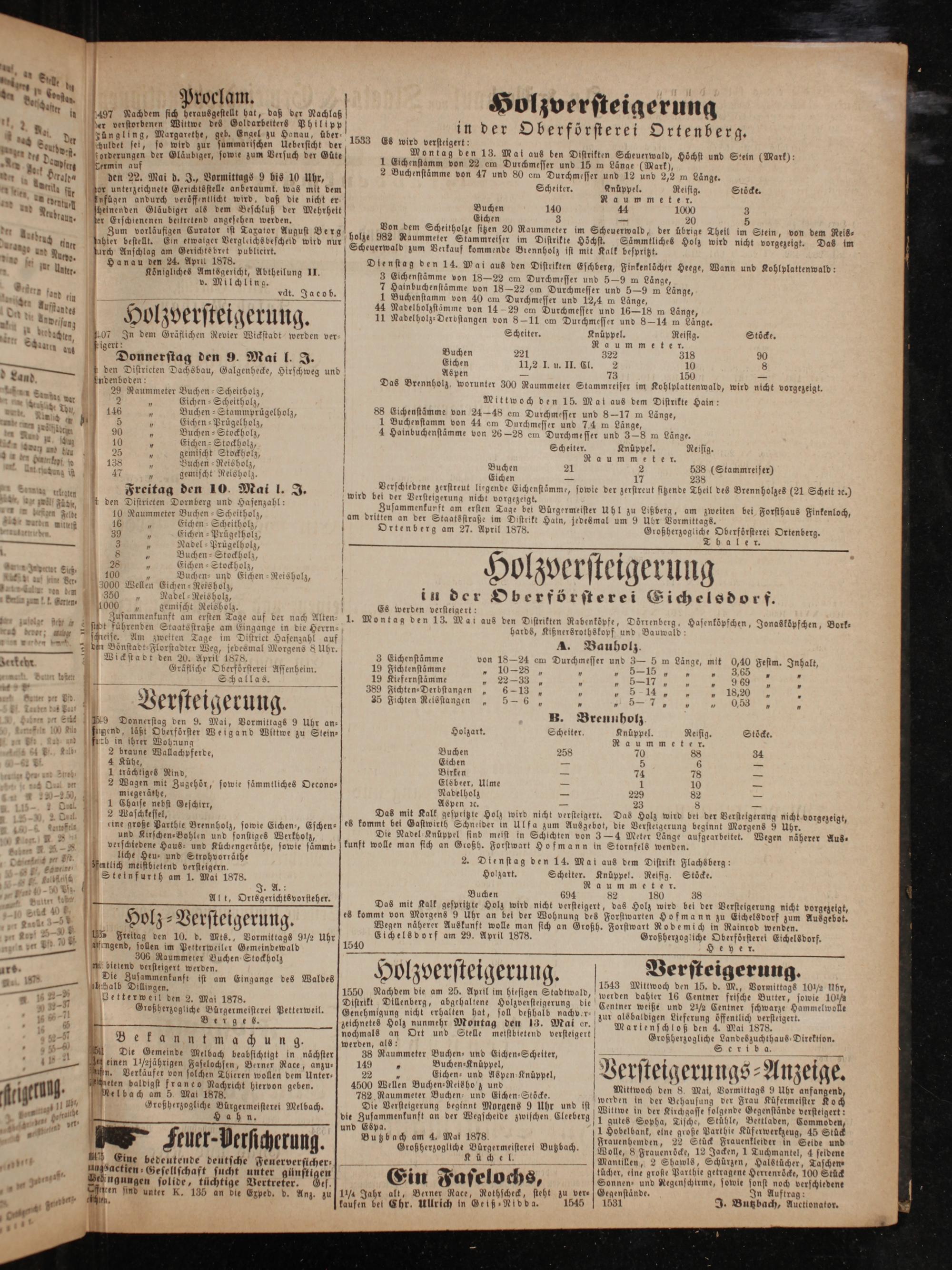 Wa Proclam. Holzversteigerung n 497 Nachdem sich herausgestellt hat, daß der Nachlaß ö 75 4 1 l. 2 1 der verstorbenen Wittwe des Goldarbetters Philipp in der O berförsterei Ortenberg. 4 u d, Sung lies, e 95 ae 1533 Es wird versteigert: en en bum Bersuch ber Güte Montag den 13. Mal aus ben Distrikten Scheuerwald, Höchst und Stein(Mark): ** d. Dein auf ger, 5 Eichenstamm von 22 om Durchmesser und 15 m Länge(Mark), un 5, g 5 a 1 2 Buchenstä von 47 und 80 e e d 12 und 2,2 zänge. 1 dent eralda den 22. Mai d. J., Vormittags 9 bis 10 Uhr, e eee 15 5 8 n Stöck . dars ir dor unterzeichnete Gerichtsstelle anberaumt, was mit dem helter. nuppel.. eisig. ocke. . 8 Iufügen andurch veröffentlicht wird, daß die nicht er Buch 5 N* m m e 0 1 * n eee sbelnenden Gläubiger als dem Beschluß der Mehrheit n 9 90 braun. fer Erschienenen beikretend angeseben werden. f Eichen Bin,— 20 15 f er Zum vorläufigen Curator ist Taxator August Berg bol keln Scheitholze sitzen 20 Raummeter im Scheuerwald, der übrige Theil im Stein, von dem Reis⸗ l 15743 ahter bestellt. Ein etwalger Vergleichs bescheid wird nur bolze s aummeter Stammreiser im Distrikte Höchst. Sämmtliches Holz wird nicht vorgezeigt. Das im ann n dntt urch Anschlag am Gerichtsbret publieirt. Scheuerwald zum Verkauf kommende Brennholz ist mit Kalk bespritzt. dne% uns 0 Hanau den 24. Apr 1878. Dienstag den 14. Mai aus den Distrikten Eschberg, Finkenlöcher Heege, Wann und Kohlplattenwald: N lar Unter. Koͤnigliches Amssgericht, Abtheilung II. 3 Elchenstämme von 18—22 em Durchmesser und 5—9 m Länge, 93 v. Milchling. 7 Hainbuchenstämme von 18—22 em Durchmesser und 5—9 m Länge, 1 7 fand tin. Zacob. 1 ii von 40 em Durchmesser und 12,4 m Länge, e Nad 1 1 44 Nadelholzstämme von 14 29 em Durchmesser und 16—18 m Länge, 8 antes 5 12 0 6 0 8 2 Derb 5 15 73 15 im kame 0g Ho zver eigerung. 11 Nadelholz⸗Derbstangen 8 om. 0 8—14„ 3 * 4 dachten, N dem Gräflichen Revier Wickstadt werden ver 5 cee 2 4 21875 1 9.. aun u 5 uchen 221 32² 318 90 l Donnerstag den 9. Mai l. J. Eichen 11,%% 23 10 8 den Distrieten Dachsbau, Galgenhecke, Hirschweg und Aspen— 73 150 2 5 ndenboden: