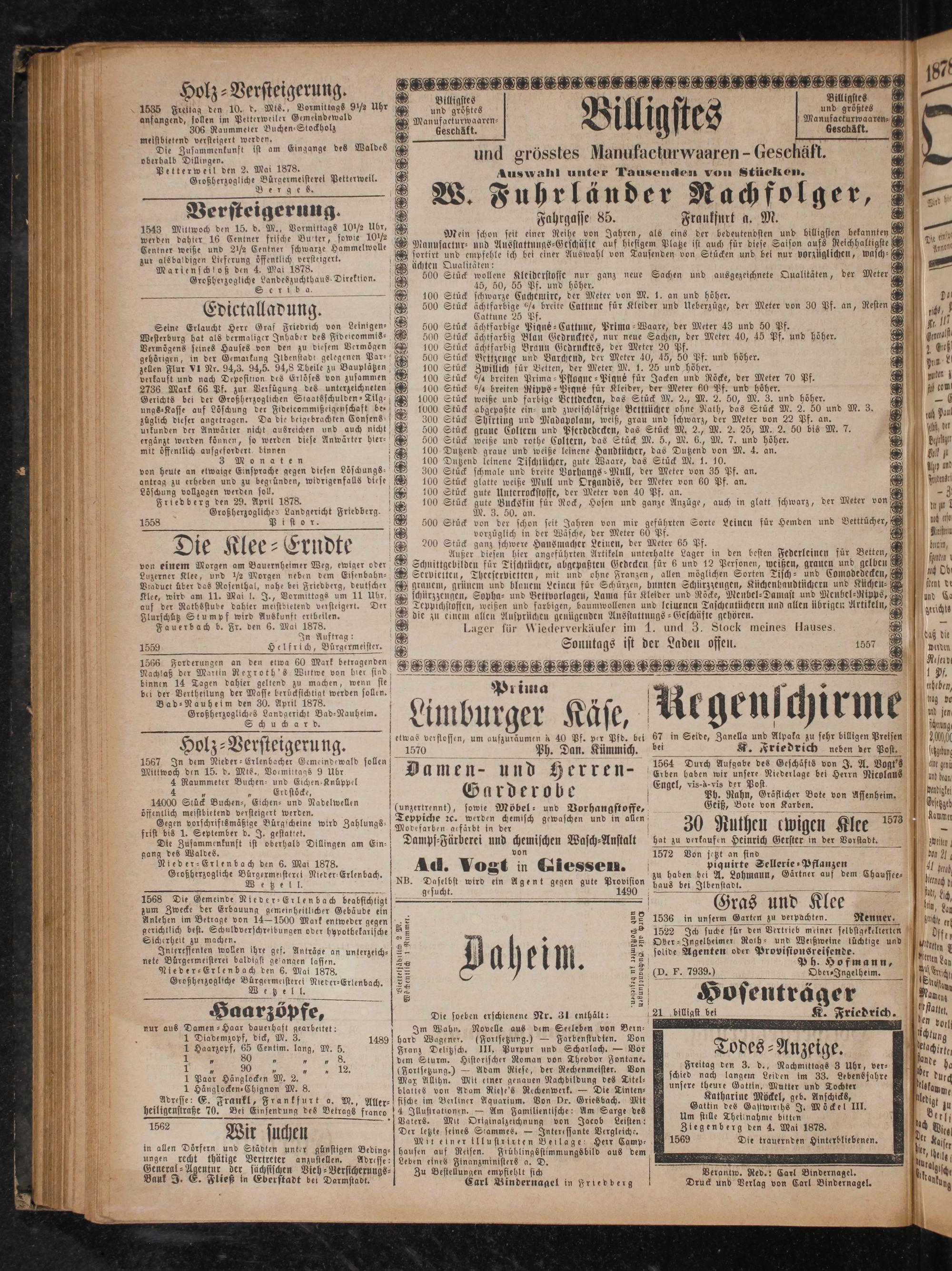 8551 Mein schon seit einer Reihe von Jahren, als eins der bedeutendsten und billigsten bekannten* Manufactur⸗ und Ausstattungs⸗Geschäfte auf hiesigem Platze ist auch für diese Saison aufs Reschhaltigste ‚ 10 ene W sortirt und empfehle ich bei einer Auswahl von Tausenden von Stücken und bei nur vorzüglichen, wasch⸗ 8 f 8 üchten Qualitäten:— 85 500 Stück wollene Kleiderstoffe nur ganz neue Sachen und ausgezeichnete Qualitäten, der Meter! 1 1 45, 50, 55 Pf. und höher. 1 22 100 Stück schwarze Cuchemire, der Meter von M. 1. an und höher. 1 D4. 500 Stück ächtfarbige/ breite Cattune für Kleider und Ueberzüge, der Meter von 30 Pf. an, Resten fg 0 4651 8 Cattune 25 Pf. 1 10 1 99 500 Stück ächtfarbige Piqué⸗Cattune, Prima⸗Waare, der Meter 43 und 50 Pf. 90 1 J. 500 Stück ächtfarbig Blan Gedrucktes, nur neue Sachen, der Meter 40, 45 Pf. und höher. 9 gnnull. 80 100 Stück ächtfarbig Braun Gedrucktes, der Meter 20 Pf. 0 5 geh 3 500 Stück Bettzenge und Barchend, der Meter 40, 45, 50 Pf. und höher. 2 91 41 88 100 Stück Zwillich für Betten, der Meter M. 1. 25 und höher. g 1 100 Stück ¼ breiten Prima-Pfloque-Piqué für Jacken und Röcke, der Meter 70 Pf. E len N 100 Stück ¾ breiten Ripps-Pigne für Kleider, der Meter 60 Pf. und höher. 2 i tem 1000 Stück weiße und farbige Bettdecken, das Stück M. 2., M. 2. 50, M. 3. und höher. 1 6 1000 Stück abgepaßte ein- und zweischläfrige Betttücher ohne Nath, das Stück M. 2. 50 und M. 3. 19 pan 2300 Stück Shirting und Madapolam, weiß, grau und schwarz, der Meter von 22 Pf. an. il 8 500 Stück graue Coltern und Pferdedecken, das Stück M. 2., M. 2. 25, M. 2. 50 bis M. 7. Ac, der B500 Stück weiße und rothe Coltern, das Stück M. 5., M. 6., M. 7. und höher. 8 dall 8 100 Dutzend graue und weiße leinene Handtücher, das Dutzend von M. 4. an. 8 Jul U 400 Dutzend leinene Tischtücher, gute Waare, das Stück M. 1. 10. 85 8 300 Stück schmale und breite Vorhangs-Mull, der Meter von 35 Pf. an. 0 d u 6 100 Stück glatte weiße Mull und Organdis, der Meter von 60 Pf. an. an 400 Ssꝗück gute Unterrockstoffe, der Meter von 40 Pf. an. 23 88 100 Stück gute Buckskin für Rock, Hosen und ganze Anzüge, auch in glatt schwarz, der Meter von 4 un 2 M. 3. 50. an. e, 8 500 Stück von der schon seit Jahren von mir geführten Sorte Leinen für Hemden und Betttücher, Ii ne 88 vorzüglich in der Wäsche, der Meter 60 Pf. Mein 25 200 Stück ganz schwere Hausmacher Leinen, der Meter 65 Pf. bun, 88 Außer diesen hier angeführten Artikeln unterhalte Lager in den besten Federleinen für Betten, 3 n! Schnittgebilden für Tischtücher, abgepaßten Gedecken für 6 und 12 Personen, weißen, grauen und gelben 1 8 S Servietten, Theeservietten, mit und ohne Franzen, allen möglichen Sorten Tischs und Comodedecken, 5 10 Ob grauem, grünem und blauem Leinen für Schürzen, bunten Schürzzeugen, Küchenhaudtüchern und Küchen⸗ tent de 95 schürzzeugen, Sopha⸗ und Bettvorlagen, Lama für Kleider und Röcke, Meubel-Damast und Meubel-Ripps, und Ce 29 Teppichstoffen, weißen und farbigen, baumwollenen und leiuenen Taschentüchern und allen übrigen Artikeln, ö richte die zu einem allen Ausprüchen genügenden Ausstattungs-Geschäfte gehören. 8 9 Lager für Wiederverkäufer im 1. und 3. Stock meines Hauses. 2 8 2 Sonntags ist der Laden offen ne 9 2 U 9 2. 1557 wliden SS S e N e N Resei FF bbb 19% Prima. 5 5 abeben, 7 77 ö 9 tag vo Limburger Käse, 1 9 5 ö schuung. etwas verflossen, um aufzuräumen à 40 Pf. per Pfd. bei 67 in Seide, Zanellg und Alpaka zu sehr billigen Preisen 1 200000 1%/%/%ͤ ůͤ́nnĩn: e dan Nai K. Friedrich neben der Post. schyhn 2 1 1564 Durch Aufgabe des Geschäfts von J. A. Vogt's nt gend EI ui men un d 9 kerren⸗-⸗ Erben haben wir unsere Niederlage bei 958 Nicolaus 0 5 NA— Engel, vis-à-vis der Post. 2K 5 1 7 0 Garderobe 6 Ph. Rahn, Gröslicher Bote von Assenheim. ait 5 sowie Möbel- und Vorhangstoffe, Geiß, Bote von Karben. 1 la eppiche ic. werden chemisch gewaschen und in allen! 1 7 AKamma Modefarben acfärbt in der 30 Rutheu(wigen Klee 3 1— Dampf⸗Färberei und chemischen Wasch⸗Anstalt bat zu verkaufen Heinrich Gerster in der Vorstadt. willen von 1572 Von jetzt an sind bon 2 l 1 5 0 Ad. Vogt in Giessen.. baten bet K. Lahnau, Ger auß ben ah 4 N 5 5 aben bei A. 0 ärtner em 5 f NB. 5 wird ein Agent gegen gute Provision baus bei Ilbenßgadl 8 i 17 1 ...... o r a5 fh 1 U 8 Gras und Klee a lin, 906 85 35 1536 in unserm Garten zu verpachten. Renner: 8 2 1522 Ich suche für den Vertrieb meiner selbsigekelterten 8 2 2 Ober⸗Ingelheimer Roth⸗ und Weißweine lüchtige und 55 U E 28 solide Agenten oder Provisionsreisende. 2 8 8 Ph. Hofmann, — 3(P. F. 7939.) Ober⸗Ingelheim. 0 2 S8 2 5— 8 5„ Hosenträger Die soeben erschienene Nr. 31 enthält: 2¹