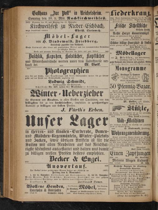 von H. Bindewald, Friedberg, Kaiserstraße gegenüber dem Rathhause. Große Auswahl aller feinen und gewöhnlichen Moͤbel aus den renommirtesten Geschäften