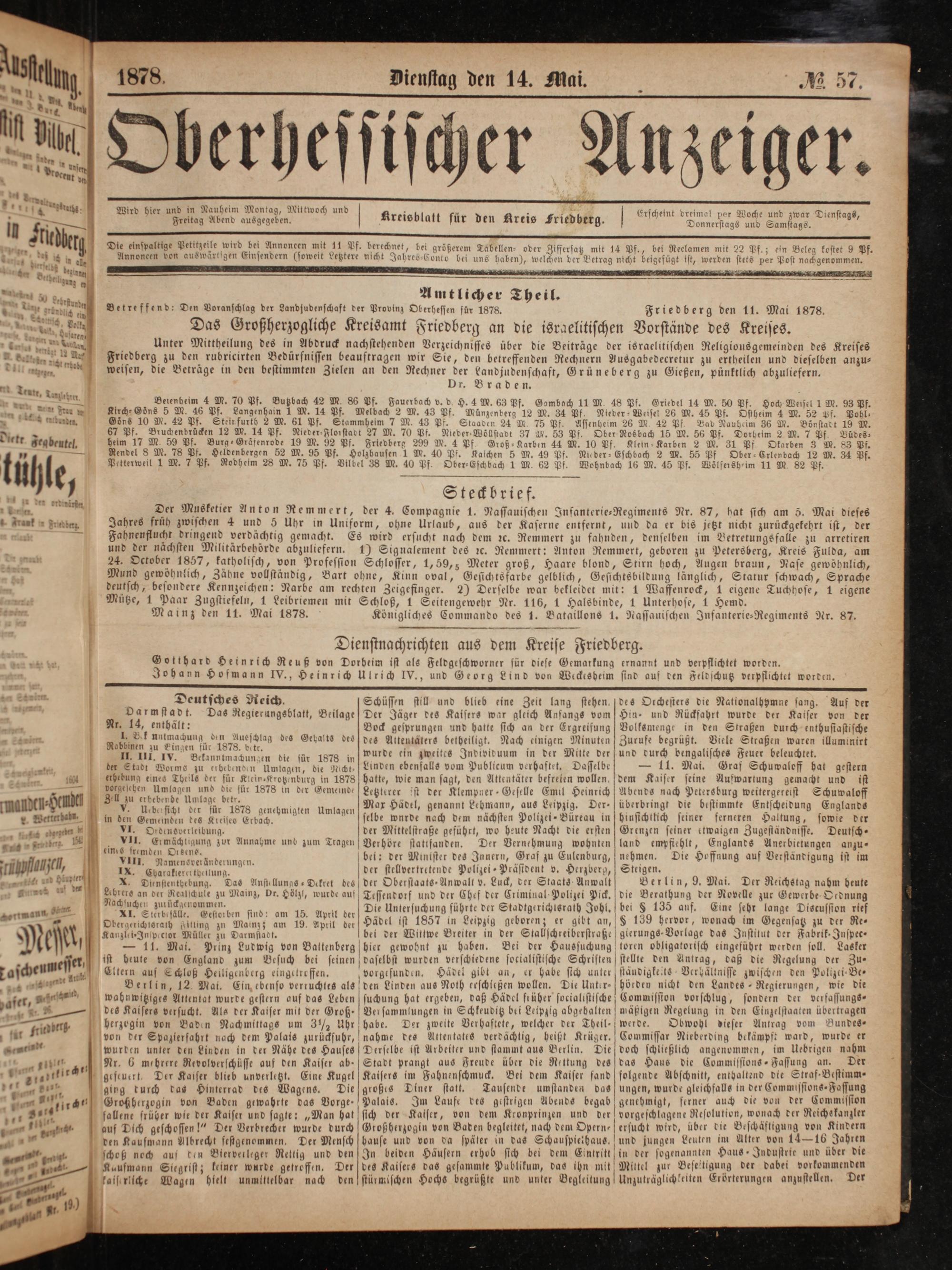 Dienstnachrichten aus dem Kreise Friedberg. Gotthard Heinrich Reuß von Dorbeim ist als Feldgeschworner für diese Gemarkung ernannt und verpflichtet worden. Johann Hofmann IV., Heinrich Ulrich IV., und Georg Lind von Weckesheim sind auf den Feldschutz verpflichtet worden.