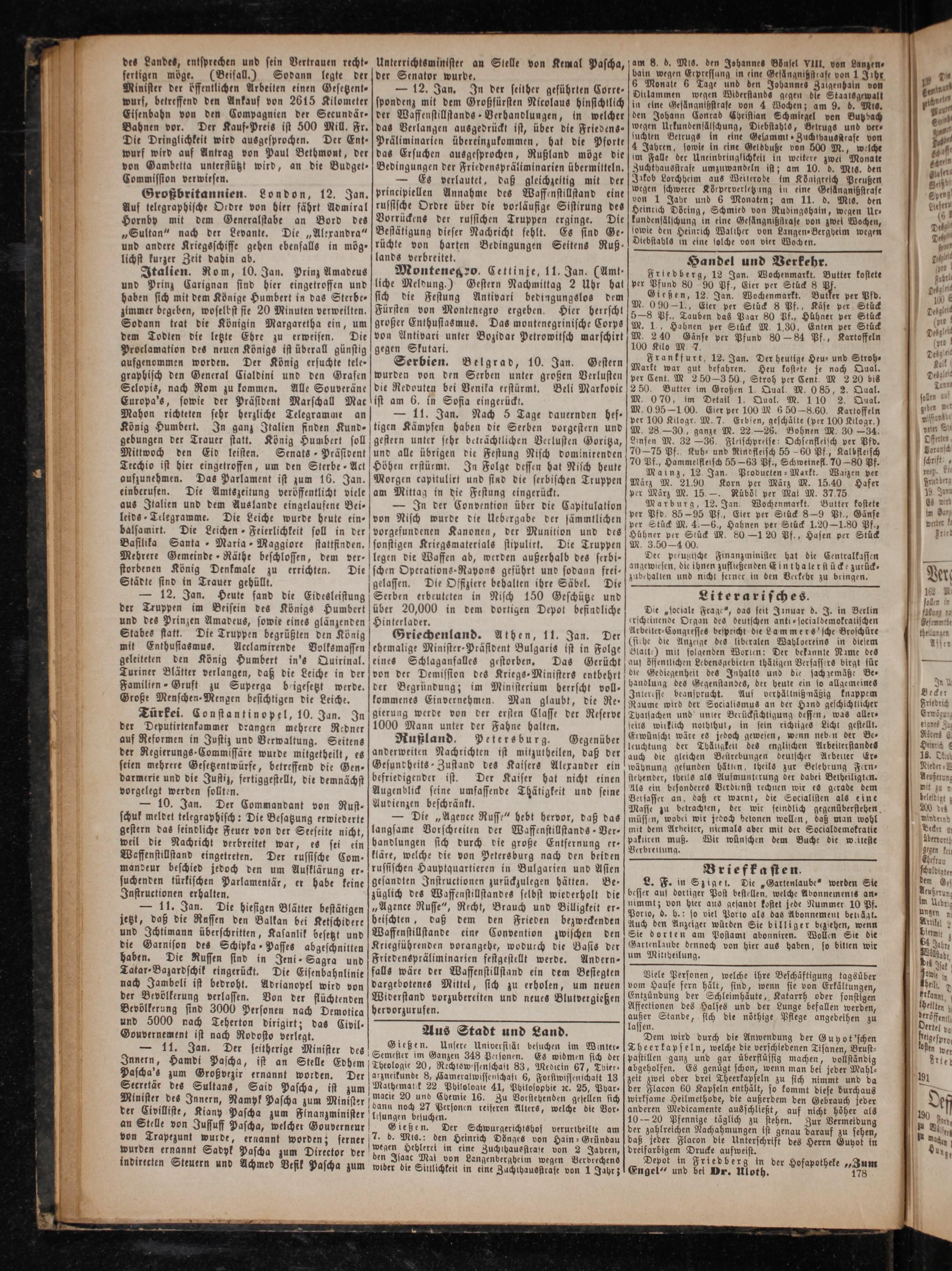 Italien. Rom, 10. Jan. Prinz Amadeus und Prinz Carignan sind hier eingetroffen und haben sich mit dem Könige Humbert in das Sterbe— zimmer begeben, woselbst sie 20 Minuten verweilten. Sodann trat die Königin Margaretha ein, um dem Todten die letzte Ehre zu erweisen. Die Proclamation des neuen Königs ist überall günstig aufgenommen worden. Der König ersuchte tele— graphisch den General Cialdini und den Grafen Sclopis, nach Rom zu kommen. Alle Souveräne Europa's, sowie der Präsident Marschall Mat Mahon richteten sehr herzliche Telegramme an König Humbert. In ganz Italien finden Kund— gebungen der Trauer statt. König Humbert soll Mittwoch den Eid leisten. Senats-Präsident Tecchio ist hier eingetroffen, um den Sterbe-Act aufzunehmen. Das Parlament ist zum 16. Jan. einberufen. Die Amtszeitung veröffentlicht viele aus Italien und dem Auslande eingelaufene Bei- leids Telegramme. Die Leiche wurde heute ein— balsamirt. Die Leichen Feierlichkeit soll in der Basilika Santa- Maria Maggiore stattfinden. Mehrere Gemeinde ⸗Räthe beschlossen, dem ver— storbenen König Denkmale zu errichten. Die Städte sind in Trauer gehüllt.