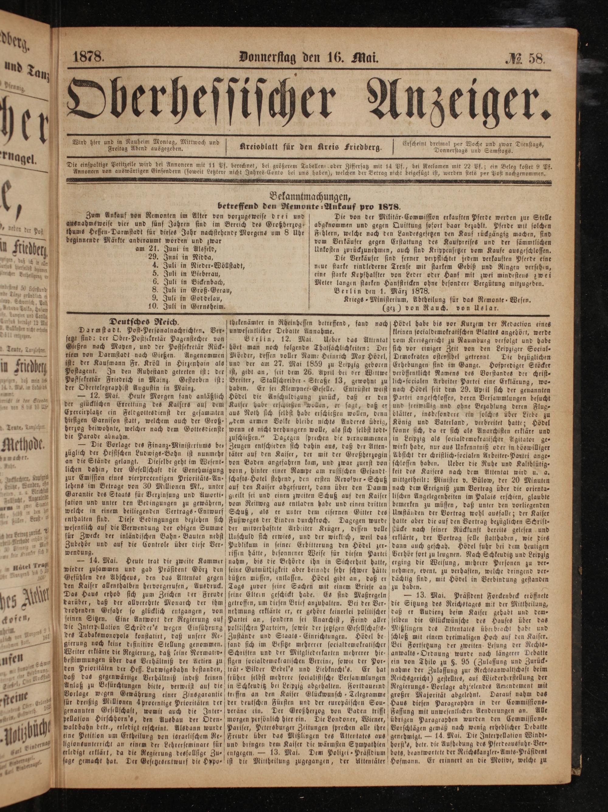 Fr 1 beginnende Märkte anberaumt worden und zwar vom Verkäufer gegen Erstattung des Kaufpreises und der sämmtlichen L fiitdber am 21. Juni in Alsfeld, Unkosten zurückzunehmen, auch sind Krippensetzer vom Kaufe ausgeschlossen. 5 N 29. Juni in Nidda, Die Verkäufer sind ferner verpflichtet jedem verkauften Pferde eine 1 4. Juli in Nieder ⸗Wöllstadt, neue starke rindlederne Trense mit starkem Gebiß und Ringen versehen, in Beben 5. Juli in Bieberau, eine starke Kopfhalster von Leder oder Hanf mit zwei mindestens z wei J 6. Juli in Bickenbach, Meter langen starken Hanfstricken ohne besondere Vergütung mitzugeben. J 8. Juli in Groß-Gerau, Berlin den 1. März 1878. 9. Juli in Goddelau, Kriegs-Ministerium, Abtheilung für das Remonte- Wesen. dal 10. Juli in Gernsheim.(gez) von Rauch. von Uslar. Deutsches Reich. thekenämter in Rheinhessen betreffend, fand nach] Hödel habe bis vor Kurzem der Redaction eines Darmstadt. Post⸗Personalnachrichten. Ver- unwesentlicher Debatte Annahme. kleinen socialdemokratischen Blattes angehört, werde en. setzt sind: der Ober-Postsekretär Pagenstecher von Berlin, 12. Mai. Ueber das Attentat vom Kreisgericht zu Naumburg versolgt und habe 1 Gießen nach Mapen, und der Postsekretär Rück- hört man noch folgende Thatsächlichkeiten: Der sich vor einiger Zeit von den Leipziger Social-—