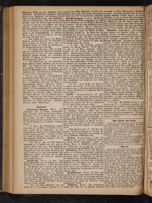 Frankreich. Paris, 12. Juli. Dem Marine⸗Ministerium ging die Nachricht von einem Ausstande der Eingeborenen in Neu⸗-Caledonien zu. 89 Personen fielen demselben zum Opfer, darunter ein Oberst. Der Gouverneur von Neu— Caledonien meldet, er sei Herr der Situation. Das Marine⸗Ministerium sandte eine Depesche, worin Energie empfohlen wird. Eine Verstärkung