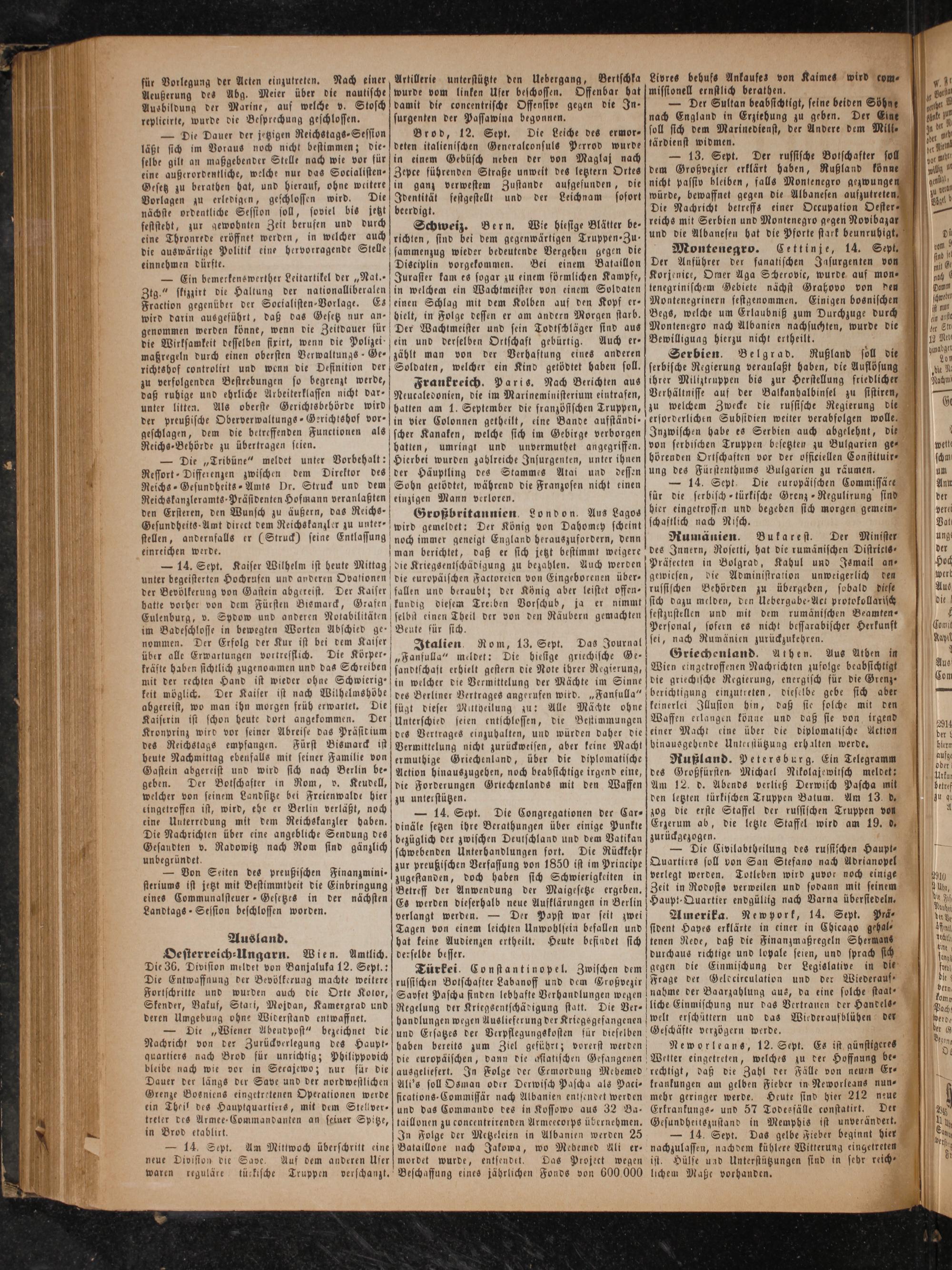 — 14. Sept. Kaiser Wilhelm ist heute Mittag] die Kriegsentschädigung zu bezahlen. Auch werden unter begeisterten Hochrufen und apderen Ovationen die europälschen Factoreien von Eingeborenen über—