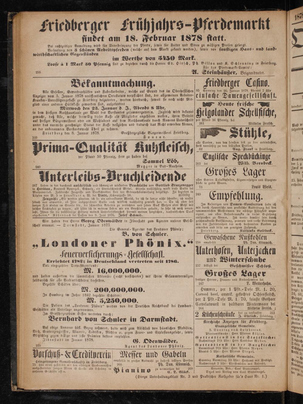 Geschästen als Unterlage angenommen.. e benen 255 5; herzo Hesse 5 91 1 hat zu verkaufen 253 Im een 0 4 it dt 2 Kücheuschränke J. Ehrlich, Friedberg. on Schuler in arm adt. Kirchliche Anzeigen für Friedberg. 5 Auf obige Annonce höfl. Bezug nehmend, halte mich zum Abschluß von häuslichen Mobilien, 2. e Vieh, Ernteerzeugnissen, Waaren, Fabriken, Mühlen ꝛc. gegen Feuer- und Explosionsgefahr, sowie Pfarramtswoche: Herr Pfarrer Köhler. Blitzschlag gegen billgge und seste Prämien bestens empfohlen. Gottesdienst in der Stadtkircher Ilbenstadt im Januar 1878. G. Odenwälder, Nachmittags 1¼ Uhr: Herr Candidat Weber. —. Gottesdienst in der Burgkirchet 2 A gent des Londoner 9 hönix. Vormittags 9½ Uhr: Herr Pfarrer Meye 5.