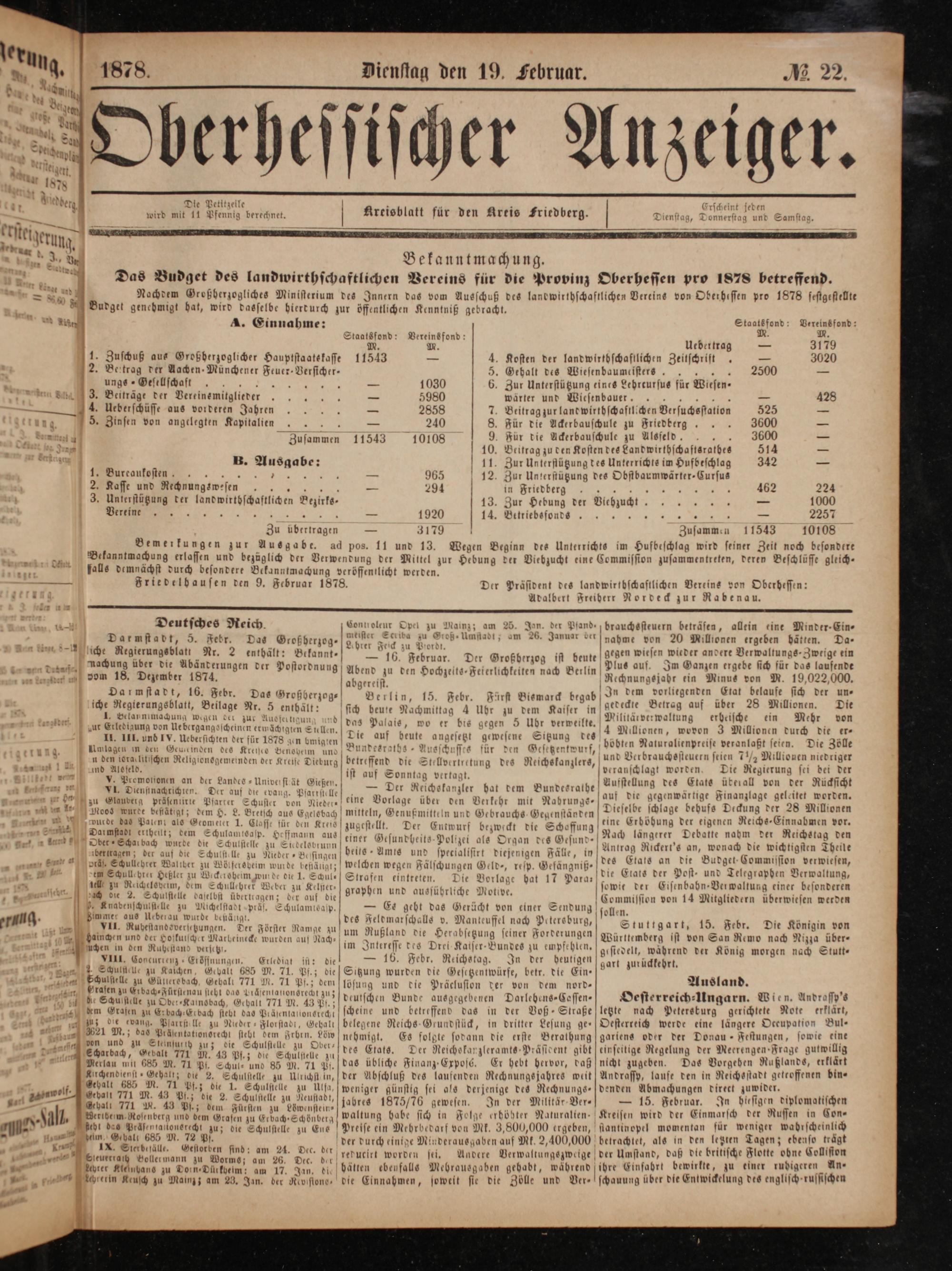„ Friedelbausen den 9. Februar 1878. Der Präsident des landwirtbschaftlichen Vereins von Oberhessen: 11 Adalbert Freiherr Nordeck zur Rabenau. u. Deutsches Reich. Lonnoleur Opel zu Mainz; am 25. Jon. der Pfand brauchssteuern beträsen, allein eine Minder-Ein⸗