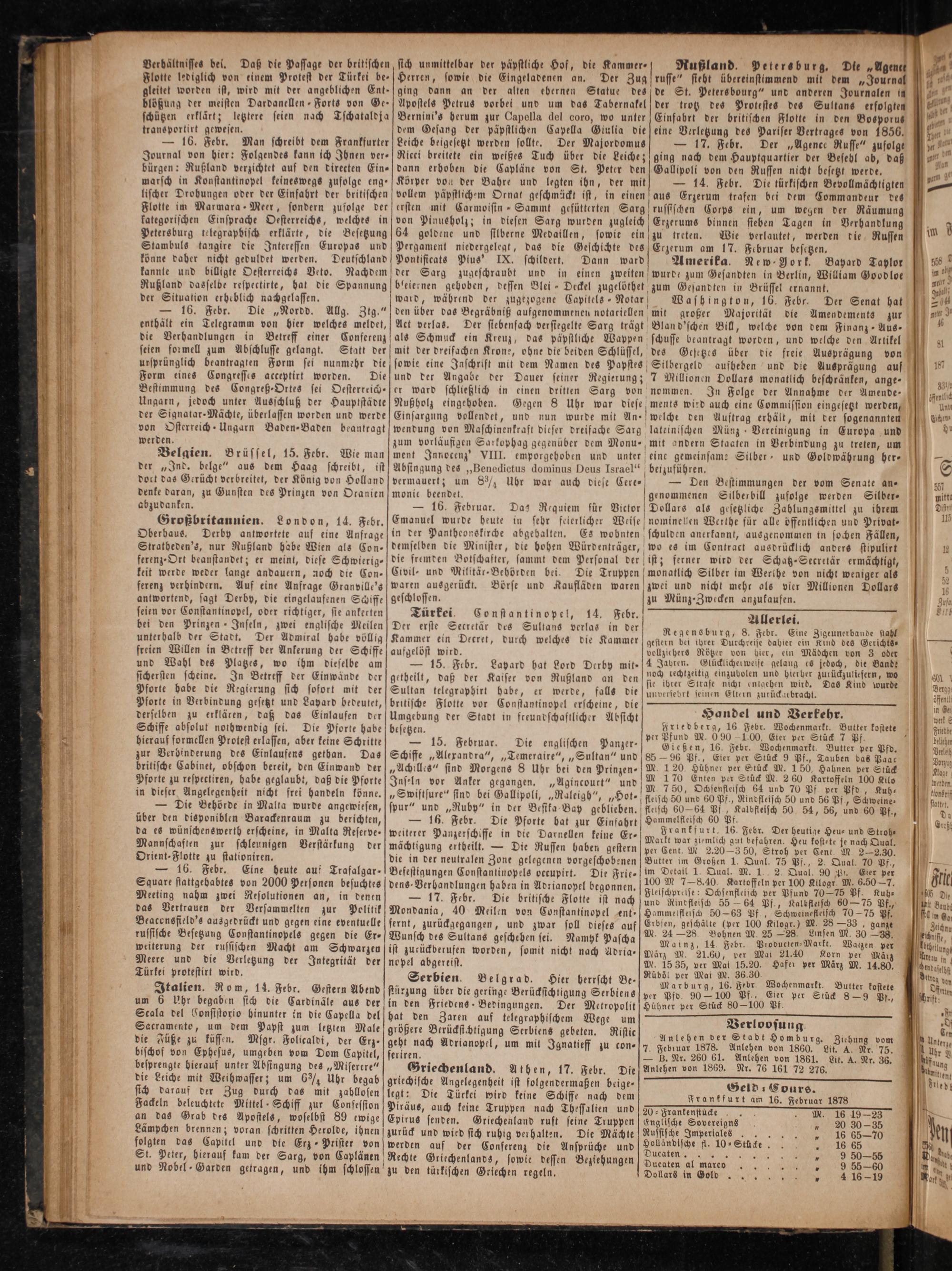 — 16. Febr. Man schreibt dem Frankfurter Journal von hier: Folgendes kann ich Ihnen ver— bürgen: Rußland verzichtet auf den directen Ein- marsch in Konstantinopel keineswegs zufolge eng- lischer Drohungen oder der Einfahrt der britischen Flotte im Marmara Meer, sondern zufolge der kategorischen Einsprache Oesterreichs, welches in Petersburg telegrapbisch erklärte, die Besetzung Stambuls tangire die Interessen Europas und könne daher nicht geduldet werden. Deutschland kannte und billigte Oesterreichs Veto. Nachdem Rußland dasselbe respectirte, hat die Spannung der Situation erheblich nachgelassen.