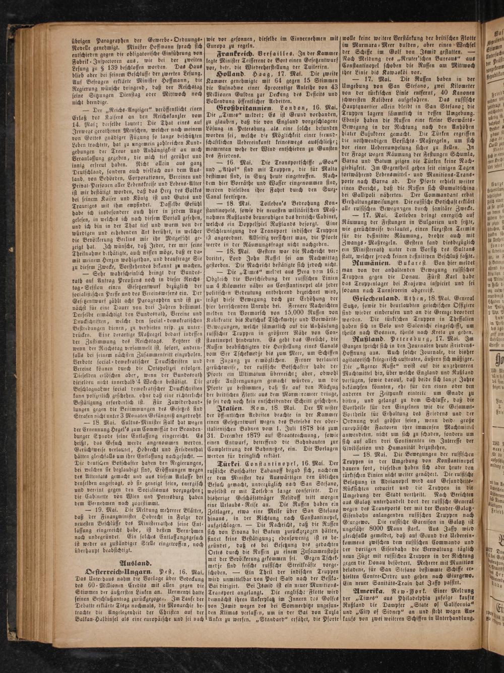 Türkei. Constantinopel, 16. Mai. Der russische Botschaster Labanoff begab sich, nachdem er dem Minister des Auswärtigen den üblichen Besuch gemacht, unverzüglich nach San Stefano, woselbst er mit Totleben lange conferirte. Der bisherige Geschäftsträger Nelidoff tritt morgen eine Urlaubs Reise an. Die Russen haben ein Zeltlager, etwa eine Meile über San Stefano hinaus, in der Richtung nach Constantinopel, aufgeschlagen.— Die Nachricht, daß die Russen sich von Livana bei Batum zurückgezogen hätten, findet keine Bestätigung; ebensowenig ist es be- gründet, daß es bei Besetzung des gedachten Ortes durch die Russen zu einem Zusammenstoße mit der Bevölkerung gekommen sei. Gegen Tschek⸗ medje sind frische russische Streitkräfte vorge⸗ schoben.— Ein Theil der indischen Truppen wird unmittelbar von Port Said nach der Besika— Bai dirigirt. Bei Ismid ist ein neuer Munitions- Transport angelangt. Die englisch: Flotte wird demnächst ihren Ankerplatz im Innern des Golfes von Ismid wegen des bei Sommerhitze ungesun—