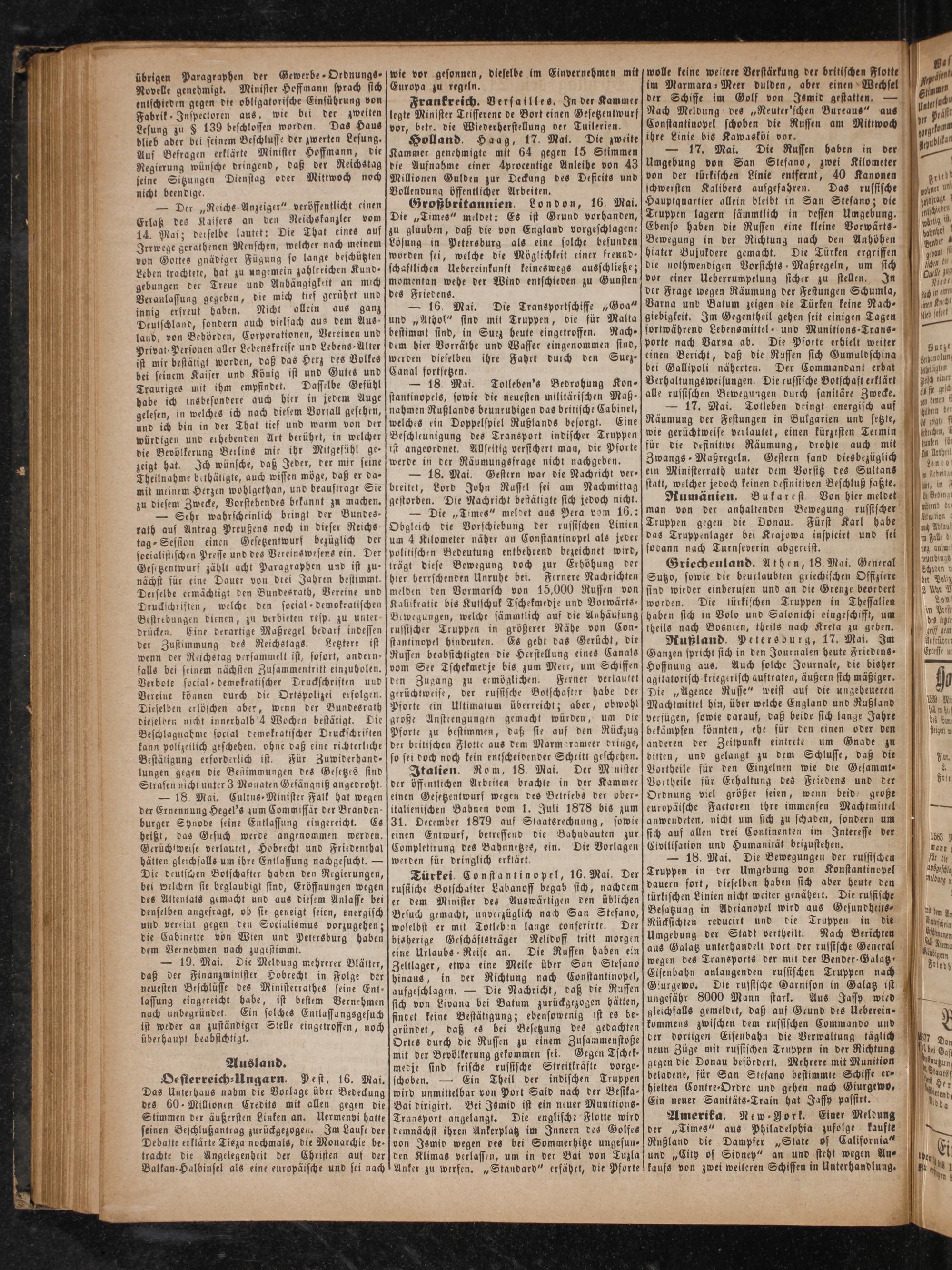 — 18. Mai. Totleben's Bedrohung Kon- stantinopels, sowie die neuesten militärischen Maß nahmen Rußlands beunruhigen das britische Cabinet, welches ein Doppelspiel Rußlands besorgt. Eine Beschleunigung des Transport indischer Truppen ist angeordnet. Allseitig versichert man, die Pforte werde in der Räumungsfrage nicht nachgeben.