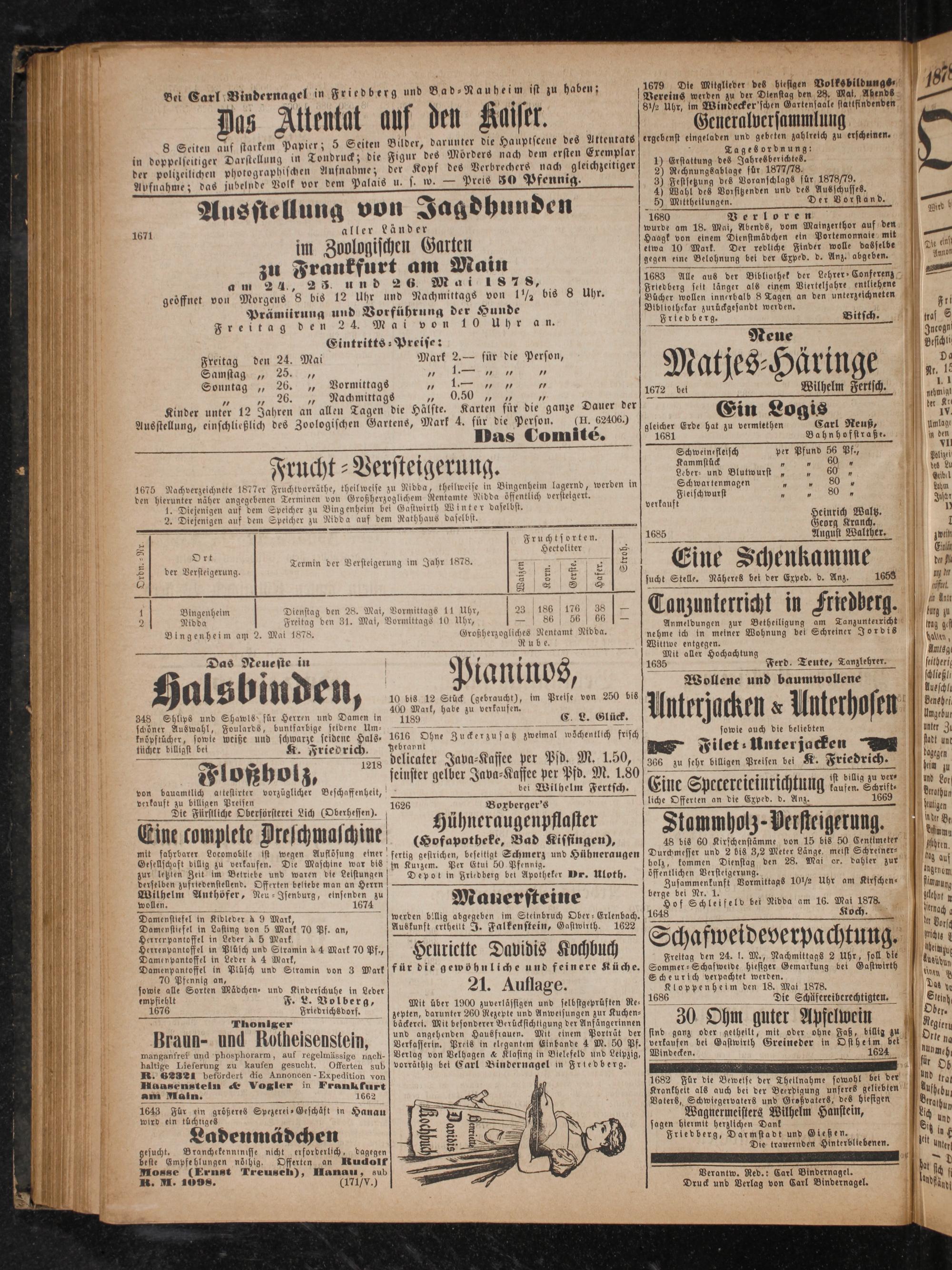 *— Das Comité. 1681 Bahnhofstraße. * 5 1 Schweinefleisch per Pfund 56 Pf., 0 cht 7 V st g 3 Kammstück„ Fruc 8 er eit erung 2 Leber- und Blutwurst„ 5 1675 Nachverzeichnete 1877er Fruchtvorräthe, theil weise zu Nidda, theilweise in Bingenheim lagernd, werden in Schwartenmagen 5 5 den hierunter näher angegebenen Terminen von Großherzoglichem Rentamte Nidda öffentlich versteigert. Fleischwurst 80 0 1. Diejenigen auf dem Speicher zu Bing enheim bei Gastwirth Winter daselbst. verkauft 1295 2. Diejenigen auf dem Speicher zu Nidda auf dem Rathhaus daselbst. einrich Waltz. 5 l eorg Krauch. 2 Fruchtsorten. 1685 August Walther. . Ort Hectoliter= 2 2— Termin der Versteigerung im Jahr 1878. 5 8 2 E Sch 1 8 der Versteigerung. 7 15 e 5 85 5— 5. 2 ine en imme 0 8 4 8 sucht Stelle. Näheres bei der Exped. d. Anz. 1653 *** 1 Bingenheim Dienstag den 28. Mai, Vormittags 11 Uhr, 23 186 176 38 Tanzunterricht in Fiedberg. 2 i Fr 0 31. Mai, Vor 0 5— 6 56 5 Apr 111 7 2 i„Nidda f ö ö Freitag den 31. Mai, Vormittags 10 Uhr, f 5 1 9 66 Armeldungen zur Bethelligung Im Tanzunterricht Bingenheim am 2. Mai 1878. Großherzogliches Nentamt Nidda. nehme ich in meiner Wohnung bei Schreiner Jordis Rube. Wittwe entgegen.
