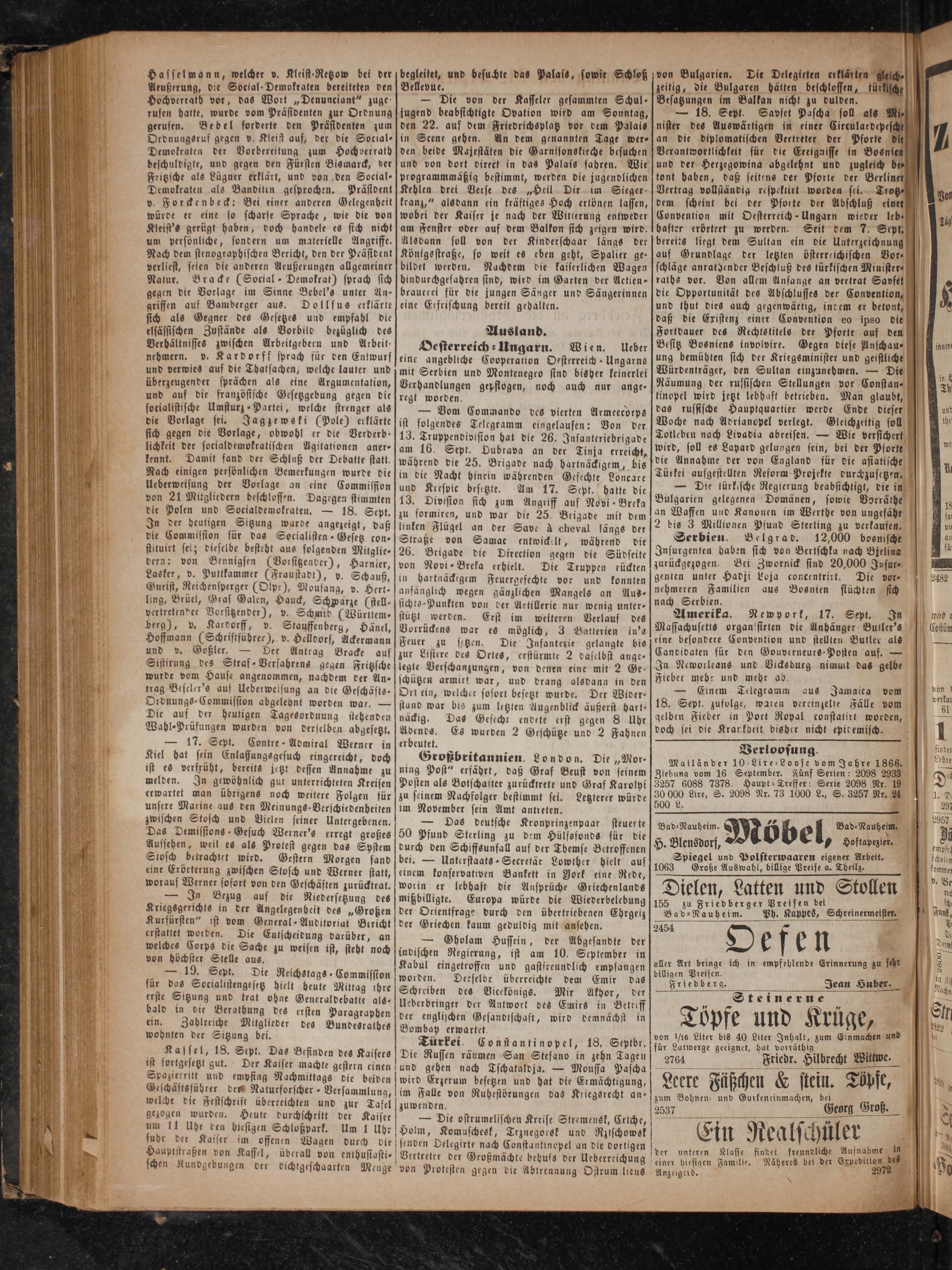 Hasselmann, welcher v. Kleist⸗Retzow bei der Aeußerung, die Social⸗Demokraten bereiteten den Hochverrath vor, das Wort„Denunciant“ zuge⸗ rufen hatte, wurde vom Präsidenten zur Ordnung gerufen. Bebel forderte den Präsidenten zum Ordnungsruf gegen v. Kleist auf, der die Social- Demokraten der Vorbereitung zum Hochverrath beschuldigte, und gegen den Fürsten Bismarck, der Fritzsche als Lügner erklärt, und von den Social- Demokraten als Banditen gesprochen. Prästdent v. Forckenbeck: Bei einer anderen Gelegenheit würde er eine so scharfe Sprache, wie die von Kleist's gerügt haben, doch handele es sich nicht um persönliche, sondern um materielle Angriffe. Nach dem stenographischen Bericht, den der Peästdent verliest, seien die anderen Aeußerungen allgemeiner Natur. Bracke(Social Demokrat) sprach sich gegen die Vorlage im Sinne Bebel's unter An- griffen auf Bamberger aus. Dollfus erklärte sich als Gegner des Gesetzes und empfahl die elsässischen Zustände als Vorbild bezüglich des Verhältnisses zwischen Arbeitgebern und Arbeit— nehmern. v. Kardorff sprach für den Entwurf und verwies auf die Thatsachen, welche lauter und überzeugender sprächen als eine Argumentation, und auf die französische Gesetzgebung gegen die sotialistische Umsturz⸗ Partei, welche strenger als die Vorlage sei. Jagzewski(Pole) erklärte sich gegen die Vorlage, obwohl er die Verderb lichkeit der socialdemokratischen Agitationen aner— kennt. Damit fand der Schluß der Debatte statt. Nach einigen persönlichen Bemerkungen wurde die Ueberweisung der Vorlage an eine Commission von 21 Mitgliedern beschlossen. Dagegen stimmten die Polen und Socialdemokraten.— 18. Sept. In der deutigen Sitzung wurde angezeigt, daß die Commission für das Socialisten-Gesetz con stituirt set; dieselbe besteht aus folgenden Mitglie- dern: von Bennigsen(Vorsitzender), Harnier, Lasker, v. Puttkammer(Fraustadt), v. Schauß, Gneist, Reichensperger(Olpe), Moufang, v. Hert- ling, Brüel, Graf Galen, Hauck, Schwarze(stell vertretender Vorsitzender), v. Schmid(Württem⸗ berg), v. Kardorff, v. Stauffenberg, Hänel, Hoffmann(Schriftführer), v. Helldorf, Ackermann und v. Goßler.— Der Antrag Bracke auf Sistirung des Straf- Verfahrens gegen Fritzsche wurde vom Hause angenommen, nachdem der An— trag Beseler's auf Ueberweisung an die Geschäfts⸗ Ordnungs⸗Commission abgelehnt worden war.— Die auf der heutigen Tagesordnung stehenden Wahl⸗Prüfungen wurden von derselben abgesetzt.