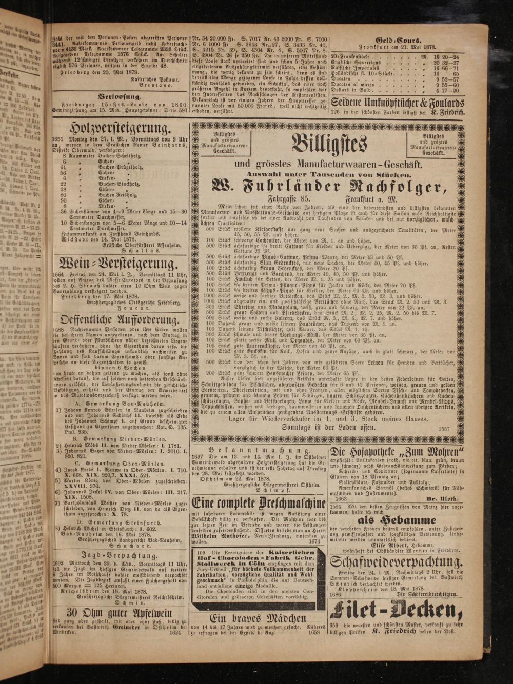 E schürzzengen, Sopha- und Bettvorlagen, Lama für Kleider und Röcke, Meubel⸗Damast und Menbel⸗Ripps, g Teppichstoffen, weißen und farbigen, baumwollenen und leineuen Taschentüchern und allen übrigen Artikeln, 8 8 Lager für Wiederverkäufer im 4. und 3. Stock meines 9 5 Sonntags ist der Laden offen. 1557 8 7 Anf 0 4¹ 1697 8 15 15 1 5 5 15 Seb r Die Hofapothele„Zum Mohren )„„ 0 0 j e 2 5 1 1— Gemeindewald abgehaltene Holzversteigerung hat die Ge empfiehlt: Anilinfarben(roth, vis ett, blau, grün, braun nehmiaung erhalten und ist der erste Fahrtag auf Dienstag Schreib- und Copirlinte(sogenannte Kaisertinte) in Ostheim am 22. Mai 1878. Gläsern von 18 Pfennig an; iche Bürgermeisterel f 5 8 zt für Nä Großherzogliche Vürgermeisterel Ostheim. Amerikanisches Sternöl(bestes Schmieröl für Näh⸗ maschinen und Instrumente). l Dr. Uloth. 1594 Mit den besten Zeugnissen von Mainz hier ange⸗ mit fahrbarer Locomobile ist wegen Auflösung kommen, halte ich mich Gesellschaft billig zu verkaufen. Die Maschine war bis, d hrten Frauen bestens blen, unter Zusicher⸗ derselben zufriedenstellend. Offerten beliebe man an Herrn den verehpten, Frauen bestens empfo n Zusich Wilhelm Anthöfer, Neu ⸗Isenburg, einsenden zu ung gewissenhafter und sorgfältiger Bedienung. Unbe⸗