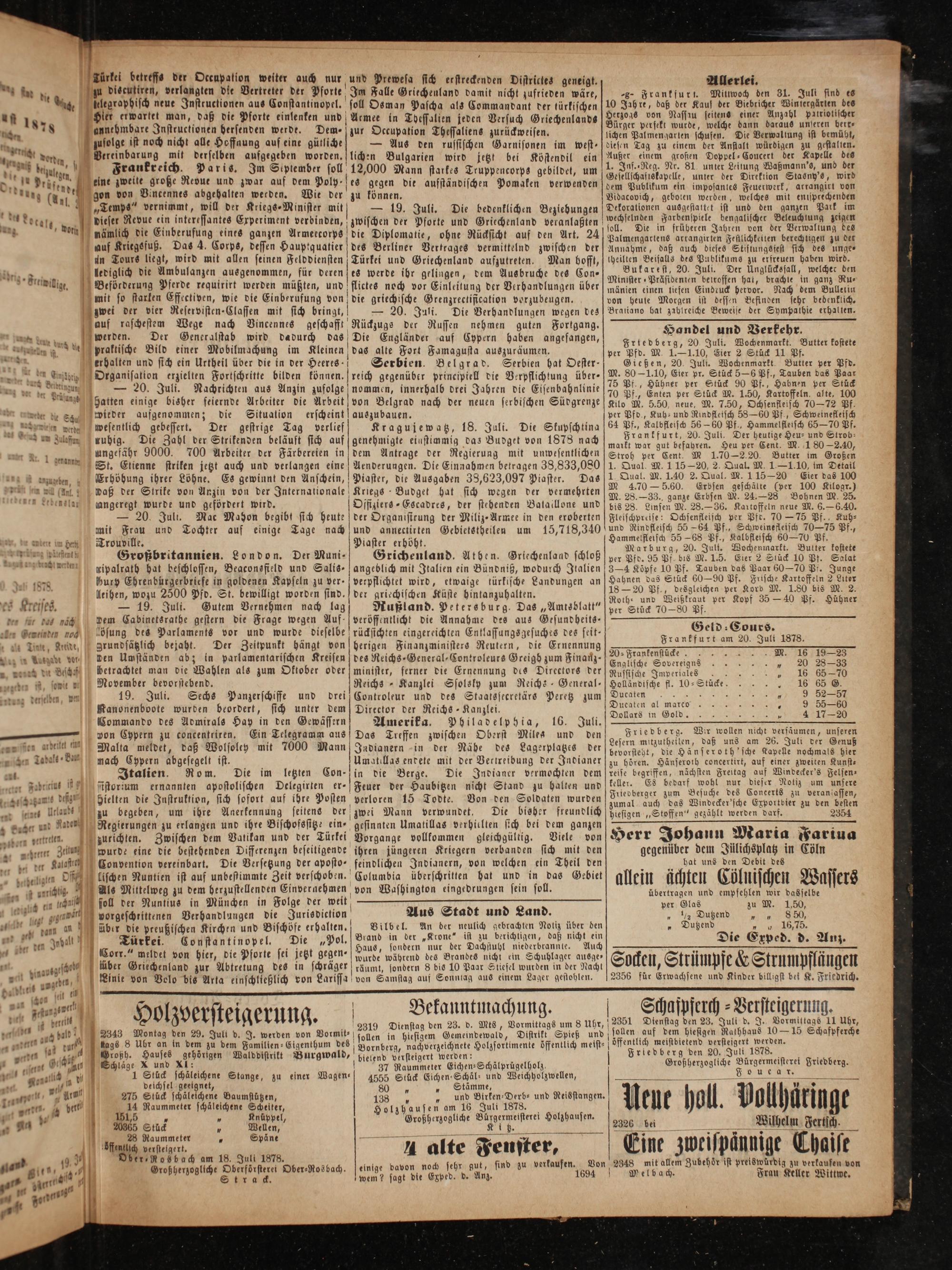 19. Juli. Sechs Panzerschiffe und drei anonenboote wurden beordert, sich unter dem Commando des Admirals Hay in den Gewässern won Cypern zu concenttiren. Ein Telegramm aus Malta meldet, daß Wolsoley mit 7000 Mann mach Cypern abgesegelt ist.