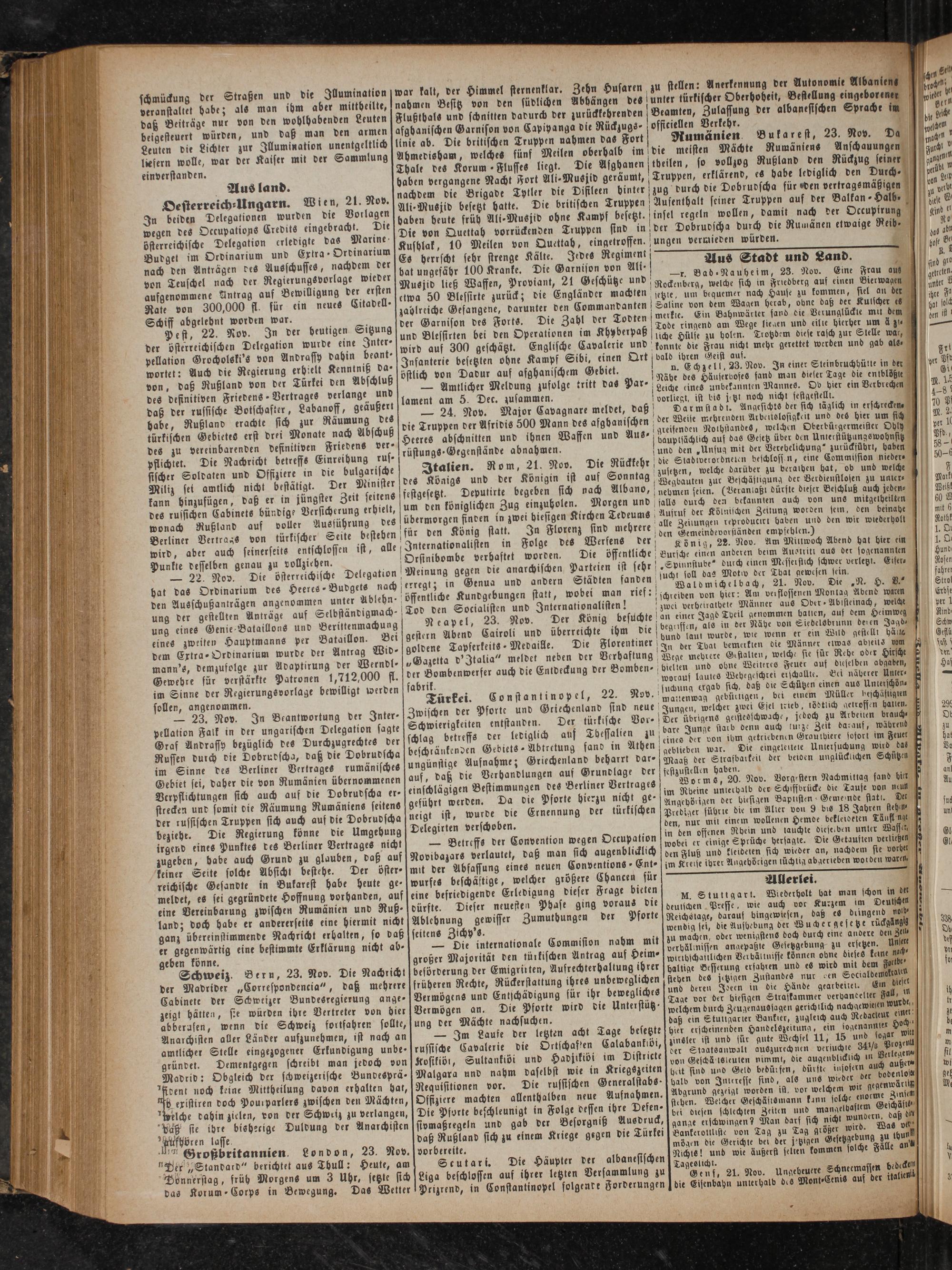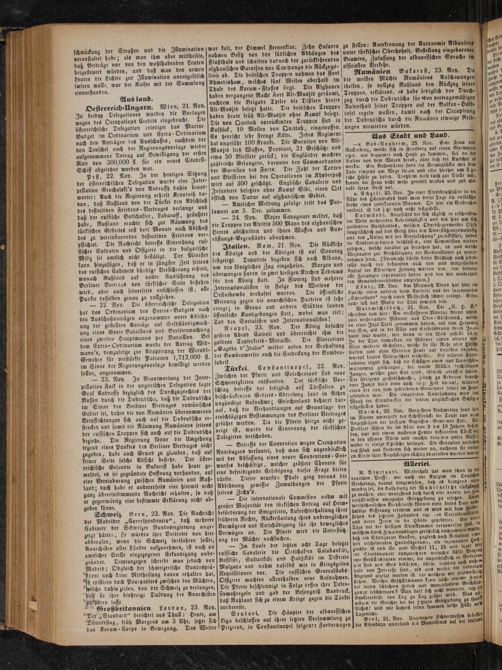 Oesterreich⸗Ungarn. Wien, 21. Nov. In beiden Delegationen wurden die Vorlagen wegen des Occupations Credits eingebracht. Die österreichische Delegation erledigte das Marine: Budget im Ordinarium und Extra Ordinarium nach den Anträgen des Ausschusses, nachdem der von Teuschel nach der Regierungsvorlage wieder aufgenommene Antrag auf Bewilligung der ersten Rate von 300,000 fl. für ein neues Citadell⸗ Schiff abgelehnt worden war.