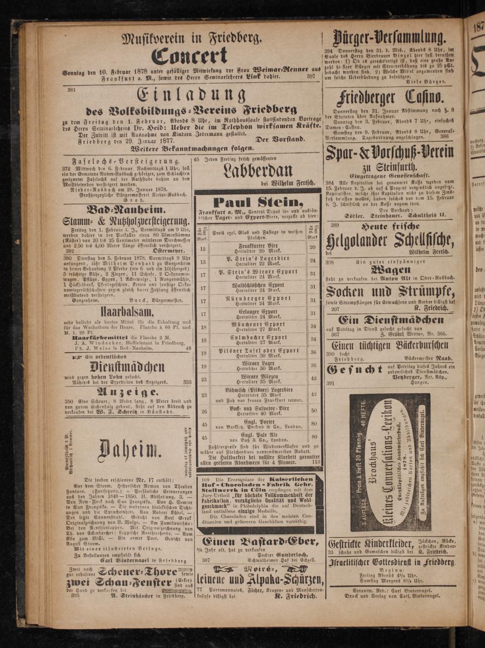 Sonntag den 10. Februar 1878 unter gefälliger Frankfurt a. M.,