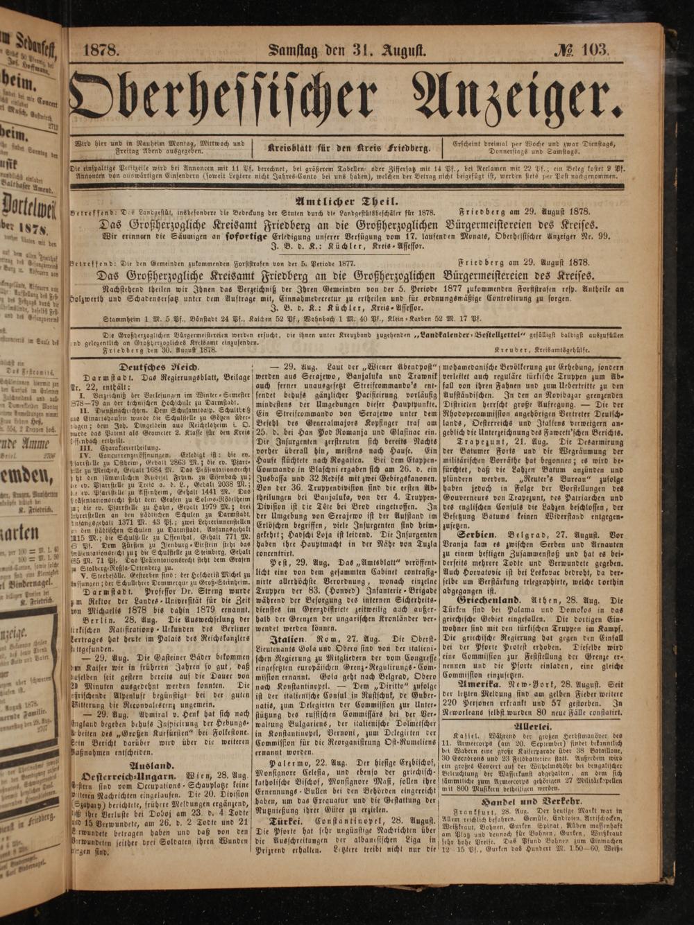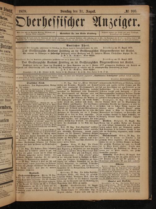 * Sealt del nd gelegentlich an Großherzogliches Kreisamt einzusenden. Friedberg den 30. August 1878. Kreuder, Kreisamtsgehülfe.