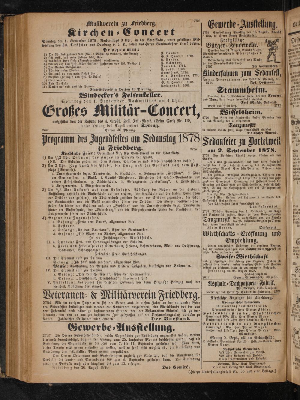 Sonntag den 1. September 1878, Nachmittags 3 Uhr, in der Stadtkirche, unter gefälliger Mit⸗ wirkung von Frl. Dröscher aus Homburg v. d. H., sowie des Herrn Seminarlehrer Link dahier.